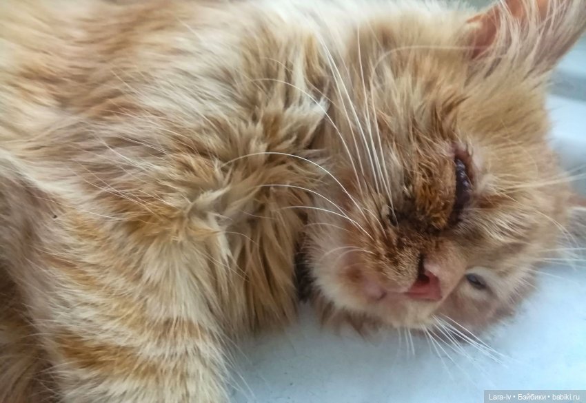 Что было с котиком? По всем приметам он летун. Навернулся с этажа. Причем крайне неудачно приземлился, лишившись глаза и сильно ударив зубы с этой же стороны. Наверняка были и внутренние повреждения, хотя ветеринар не нашел критических.