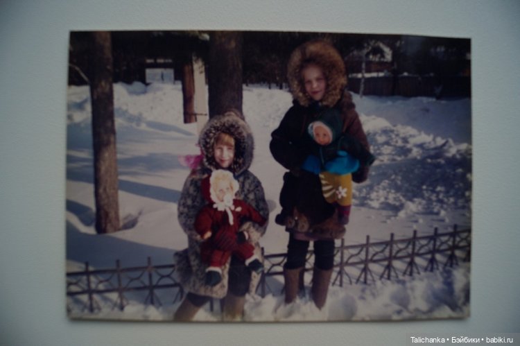 Ой, я тоже не могу, чтобы кукла на улице голая была. У меня старшая дочка с куклой ходила в садик, у нас на каждое время года полноценный комплект был. Куколка до сих сохранилась, хочу со временем и её вылечить. И когда младшая сестрёнка росла, я её куклу одевала полностью и кукол её подруги не забывала) Вот есть фото из 90-х Моя сестрёнка в светлой шубке со своей Сюзаной, а ей подружка Иринка стоит со своим Димочкой — все одеты тепло, как положено в холодную уральскую зиму) Обе эти куколки теперь живут у меня) любимые, нарядные, тоже как то лечились в нашей кукольной лечебнице)