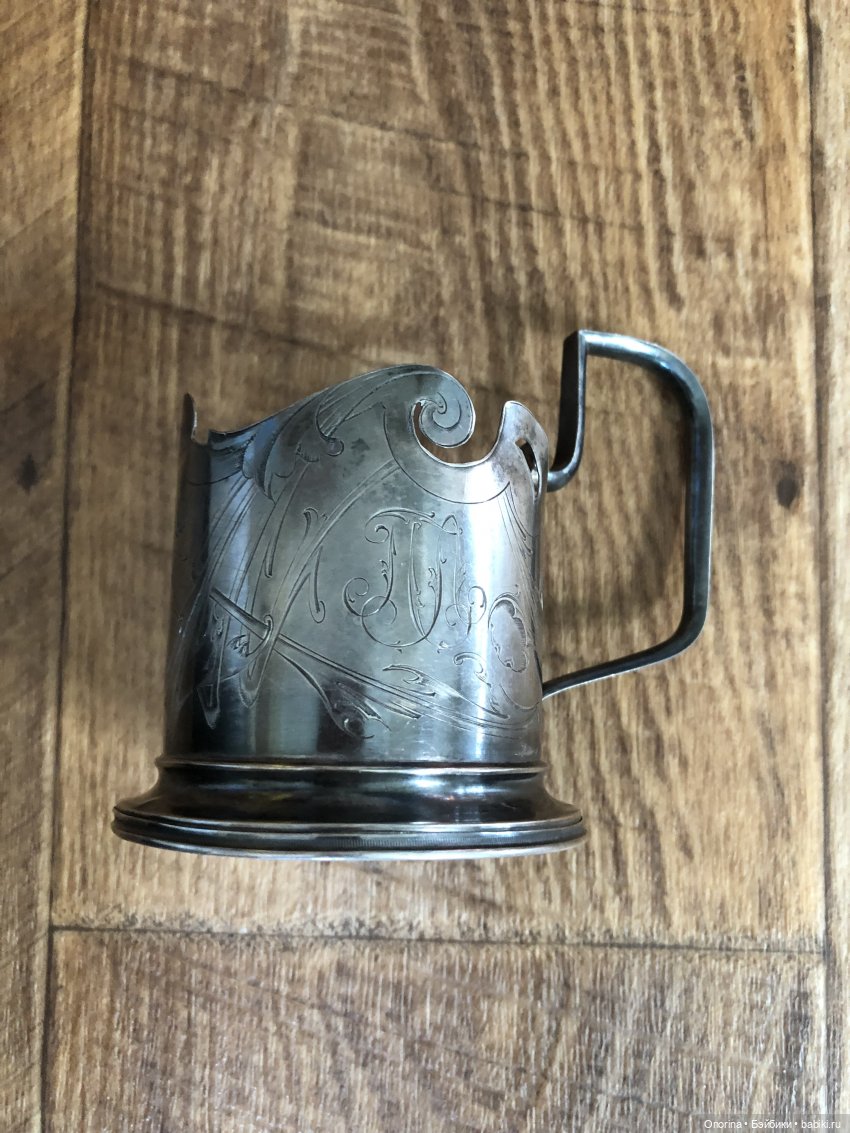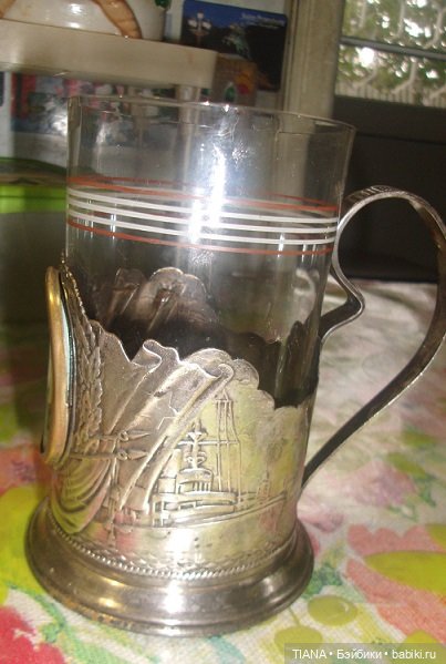 Вот этот мельхиоровый подстаканник у нас был всегда. Его. когда начистишь содой или зубной пастой, он такой блестящий. как серебряный. На нём клеймо ЛЭ, и изображён Ленинград. Я им пользуюсь редко.