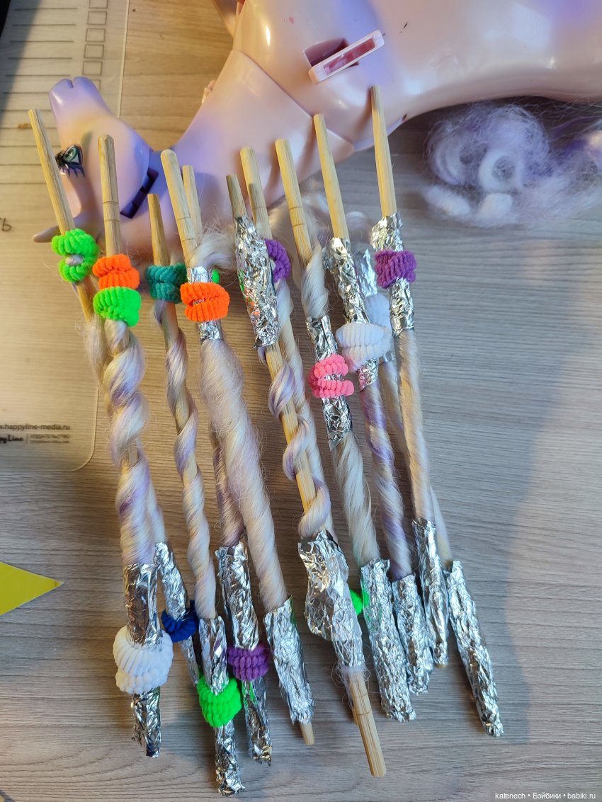 Пока волосы были горячие и мягкие, я разобрала каждый локон и накрутила на карандаши, ручки, всё что под руку попало, закрепила прищепками. У меня есть палочки от роллов, надо попросить Андрея, чтобы он их на равные части распилил и пошкурил. Чем тоньше будут импровизированные бигуди, тем кудри будут более естественные по размеру куклы.