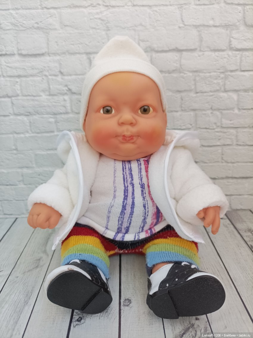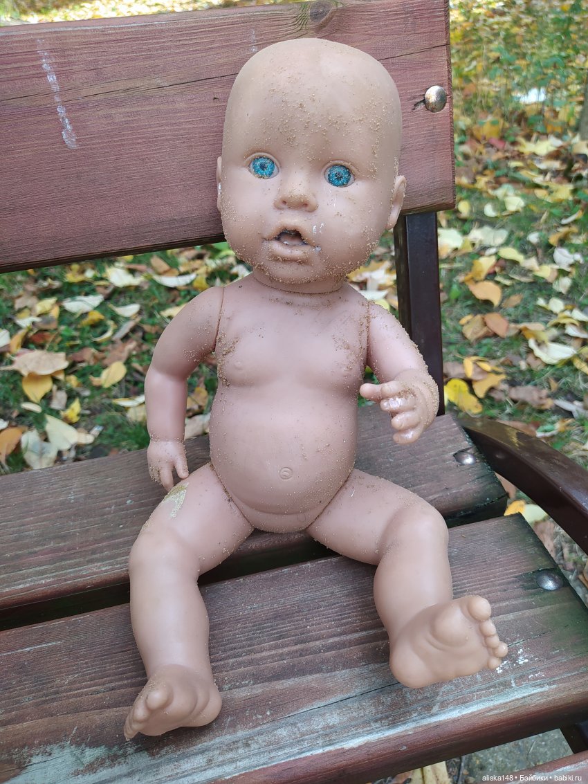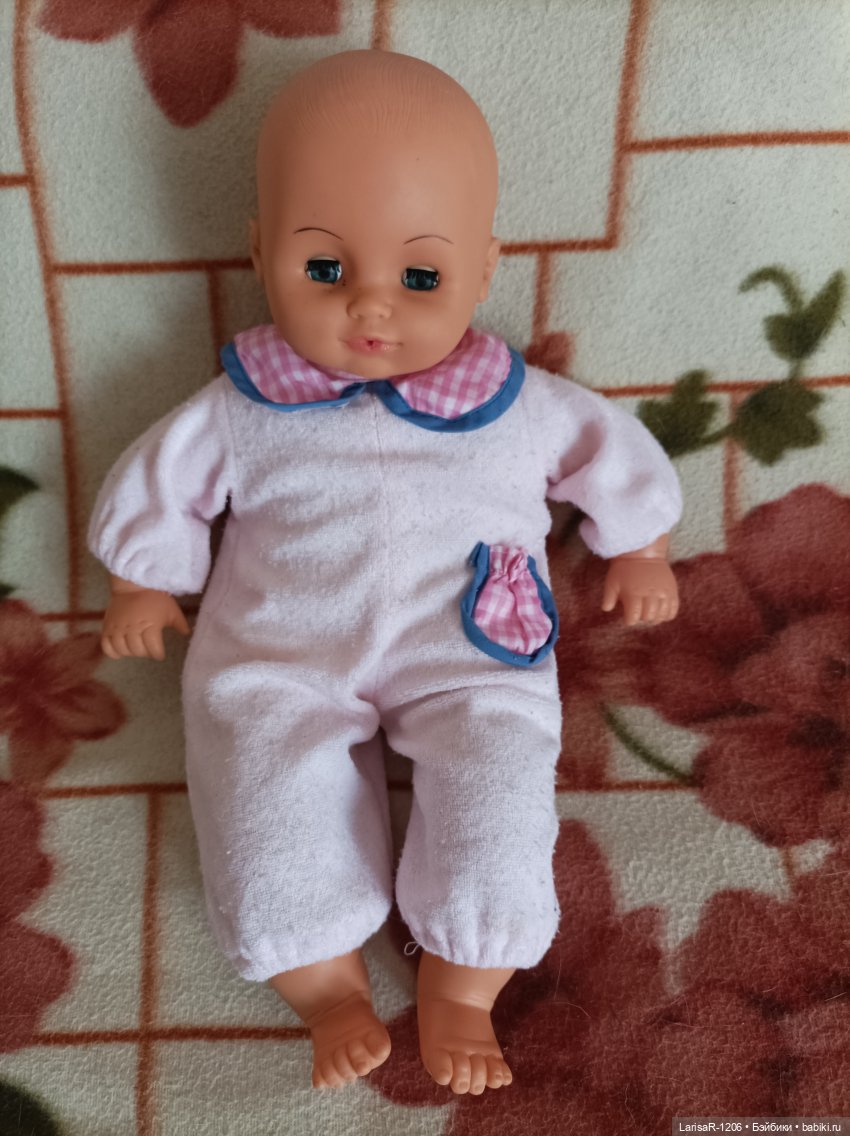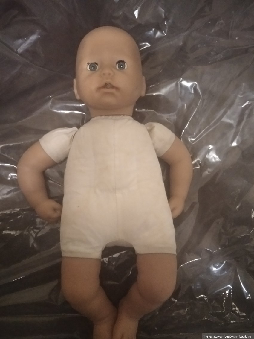 Первой было решено заняться пупсом с пищиком, который на фото в мальчуковой одежде, хотя, это несомненно девочка (ну мы так с дочкой решили), тело ростом 30 см, в хорошем состоянии, голова валялась отдельно, глазки моргают, синхронные, во рту отверстие для соски, все с куколкой хорошо, только волосы очень плохие, редкие, и жесткие как мочалка. Мытье с кондиционером не смягчило волосы, но они стали чистыми.