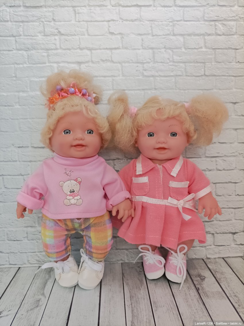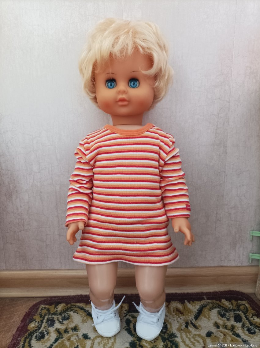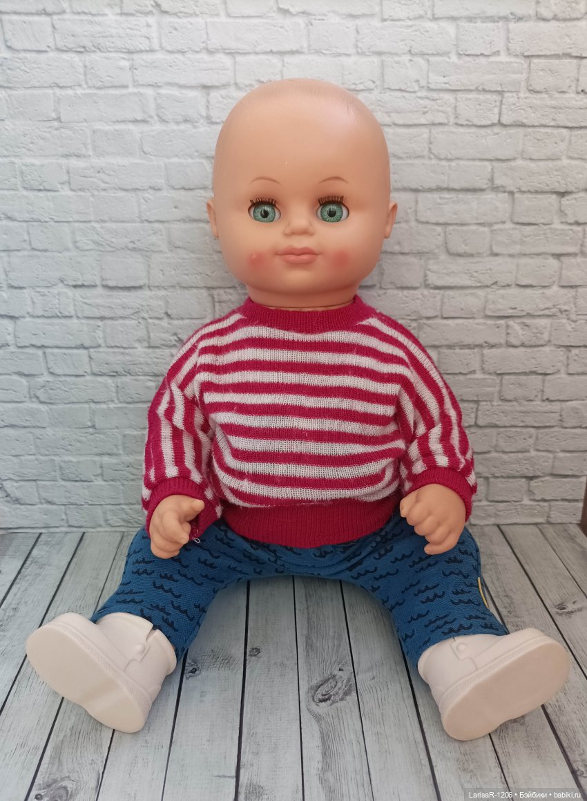 Первой было решено заняться пупсом с пищиком, который на фото в мальчуковой одежде, хотя, это несомненно девочка (ну мы так с дочкой решили), тело ростом 30 см, в хорошем состоянии, голова валялась отдельно, глазки моргают, синхронные, во рту отверстие для соски, все с куколкой хорошо, только волосы очень плохие, редкие, и жесткие как мочалка. Мытье с кондиционером не смягчило волосы, но они стали чистыми.