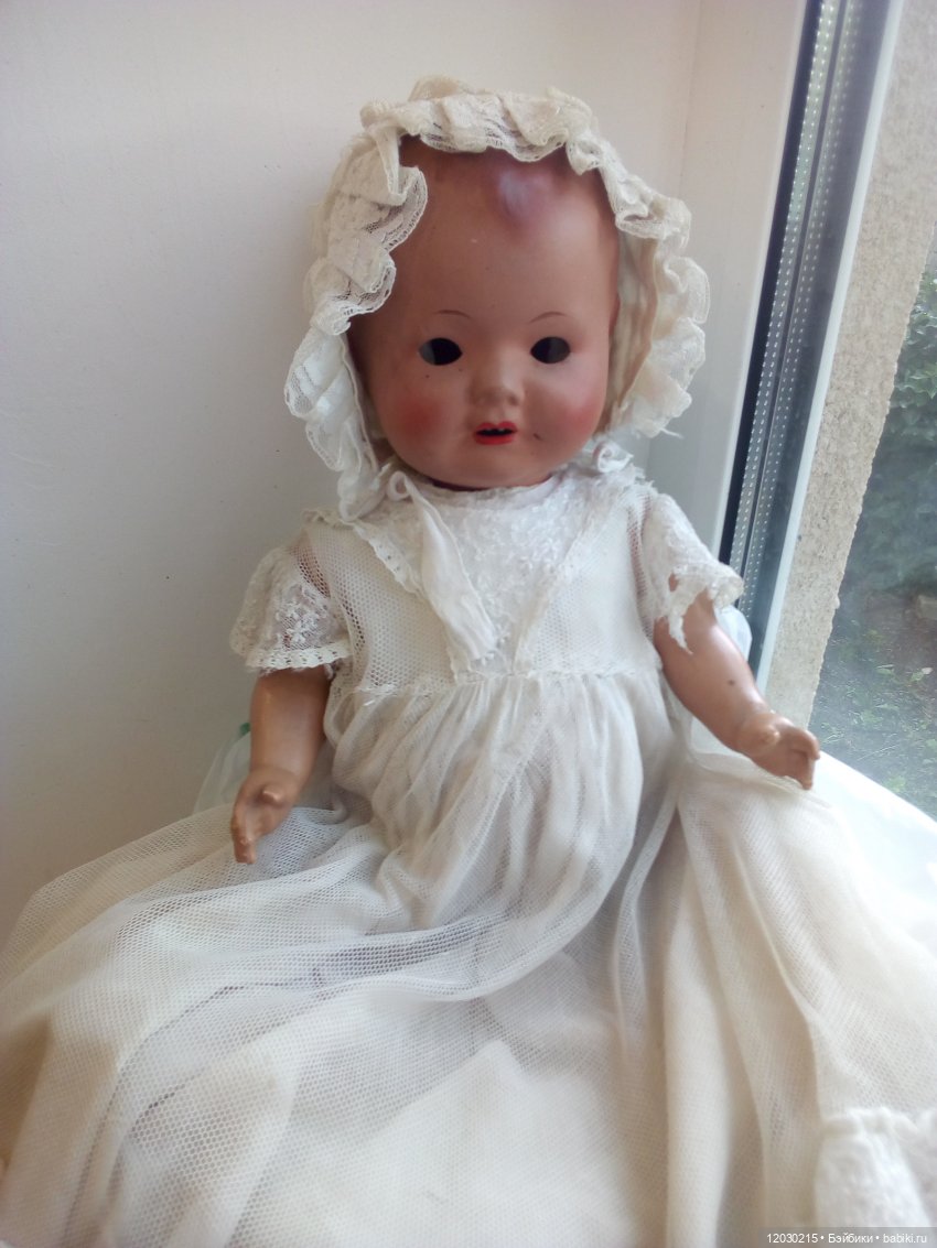 Что сделано. Восстановлены после покусов все четыре конечности, пришлось даже паять местами. Отмыта глубоко въевшаяся грязь с лица. Восстановлен мейк, восстановлен родной цвет волос, почищены глазки. Тело родное настолько грязное, что было принято решение шить новое. Оно из тика, набито опилочками. Малыш приятно тяжеленький в руках.