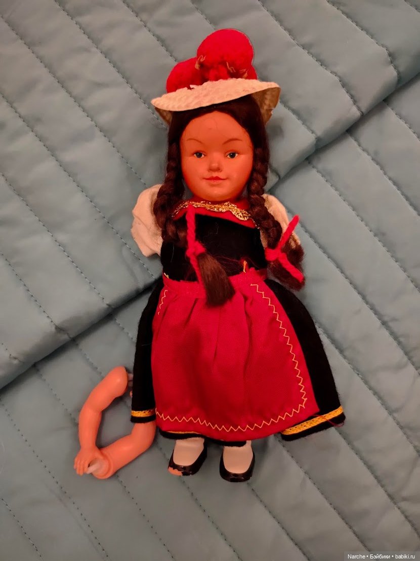Приветствую всех!) сегодня у меня сувенирные куклы. Мне кажется это самые небрежные куклы в мире. И делают их закрыв глаза, стиснув зубы от ненависти к покупателю, выбирая худшие материалы… Детали не совпадают, роспись дикая, одежда приклеена, обязательно криво и насмерть… Как такое полюбить то? Ну и вот таких я и взяла… Вообще их четверо, но готовы пока двое. Девочка и мальчик. Барышня 16 см, парик, ножка сломана, двигаются только руки, но зато из спины торчит штырь. Для танцев! Достала пассатижи, завела, посмотрела на эти судороги, видимо так она ногу и потеряла, в судорогах… Ладно, пусть торчит, не мешает, но давай дальше без судорог… Ногу долепила, покрасила. Ручки не входят в тушку, отверстия маленькие. Ну, подпилим, не вопрос. Голова зачем то покрашена более тёмным, хотя сам пластик(или не пластик?) совпадает по цвету с тушкой. Непонятно… Оттерла. Оставила только глаза, они даже не криво напечатаны, пусть будут. Губы и брови новые. Парик тоже новый с чёлкой. Платье на кнопках и труселя. То ли нужно шляпку, то ли нет… Пусть пока так погуляет.