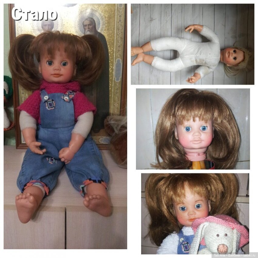 Здравствуйте, это моя первая публикация на сайте:) приятно познакомиться. Я коллекционирую кукол с 2008 года, в основном это были Браби винтажки, но недавно мне захотелось как-то разнообразить коллекцию. И вот, в составе сборного лота мне попала такая большая кукла, ростом 56 см. Девочка была одета в вязаный костюмчик, с отклеенным париком, взрослыми несуразными туфлями на каблуках, страшным бесцветным личиком и желтыми глазами.