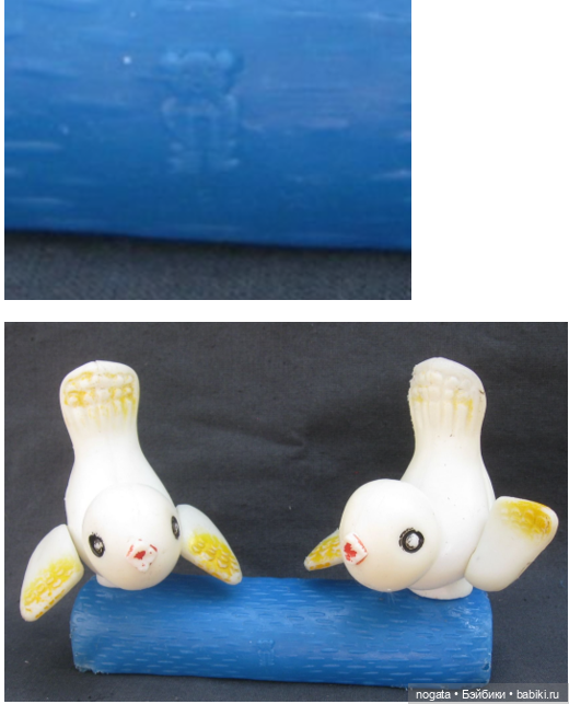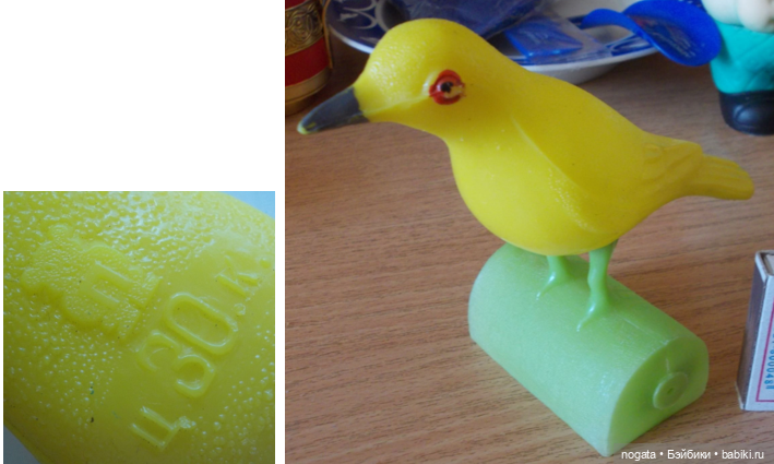 А вот птичку надо идентифицировать. У меня есть голубь от Елены zaborea, он пензинский. У этой птички клеймо другое, может тоже пенза, но более раннее — там мишка и у него начиная с живота и спускается в ножки буква П. Буду придумывать как вернуть птичке лапки и подставочку.