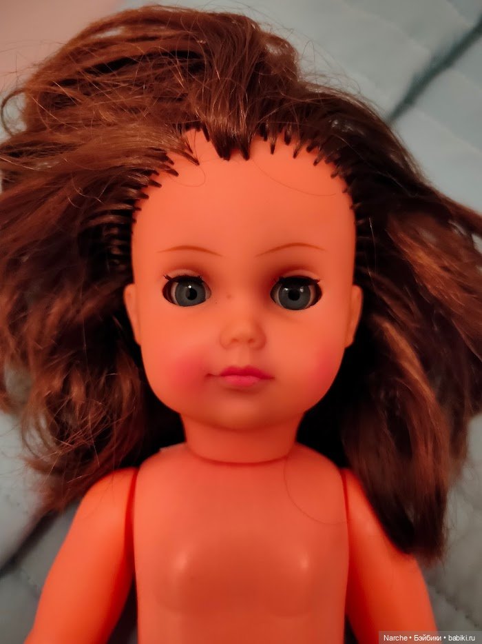 У девочки спутаны волосы, глазки провалились внутрь, не моргают. Я их сразу вынула, когда мыла куклу. Отсутствует одна ножка и крепление оставшейся ножки надорвано.