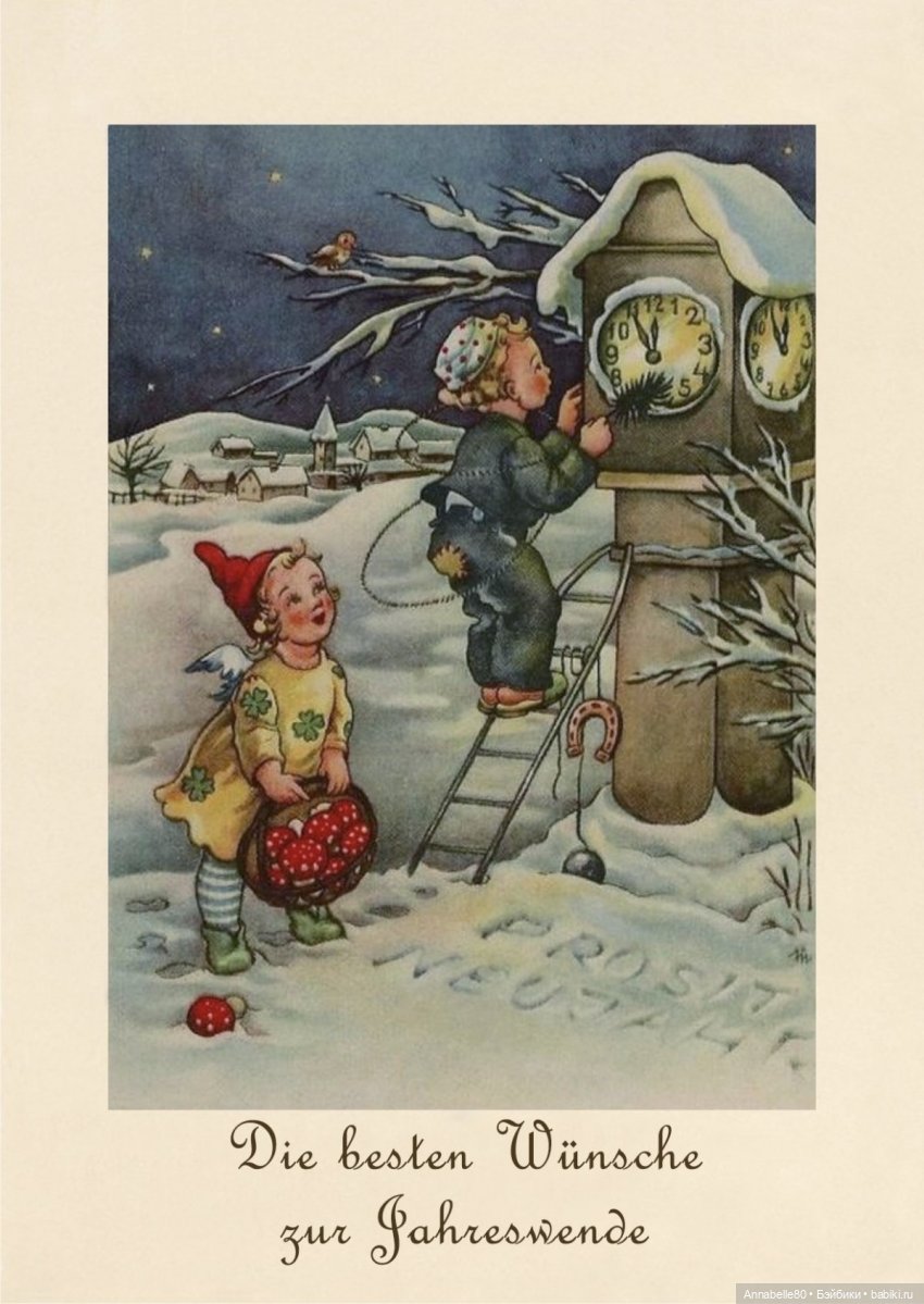 Прицеплю немецкую винтажную новогоднюю открыточку, где зашифровано пожелание удачи. Там собрано почти все, что символизирует удачу: трубочист, подкова, четырехлистник клевера и мухоморчики:)
