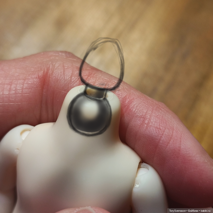 И снова одеваю голову, некоторое время радуюсь. Пытаюсь снять голову, и… На этот раз не выдерживает шарниропниемник, край обламывается. Снова долго и нудно пытаюсь вытащить провалившийся шарнир из головы. Приходит мысль сделать фиксирующую «юбочку», чтобы основание головы как бы зажималось между ней и частью, вставляемую в голову. Но элемент настолько крохотный, что все это в итоге сплавляется в бесформенный шар. Сдаюсь… Все же для хорошей динамики головы не обойтись без вскрытия тела — тогда в шею можно интегрировать более крепкий и больший по размеру шарниропниемник, который укрепит и шею, и потом собрать уже с внедрённым шарниром. Без вскрытия поверхность очень мала, поэтому сделала просто вариант фабричного штыря изменив его форму, чтобы голова не была задрана. Расширила пропил в шее, убрав лекальность для круглого шарнира, слепила новый из полимерной глины, попробовала разные формы, и посадила на суперклей.