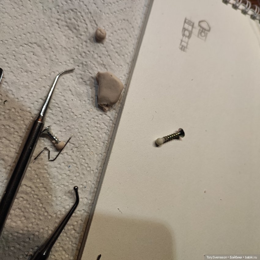 Крепила на суперклей, пластики он клеит намертво. Все воткнулось, но предсказуемо обломилось в самом тонком месте, обломок остался в голове. Долго и тяжело выуживаю его из головы. Думаю дальше. Попробовала отлить из эпоксидной смолы. Из санитарного силиконового герметика сделала форму, шарнир слепила из пластилина. Отлила, подождала пока застынет.