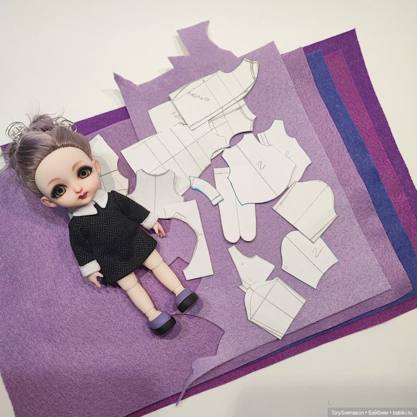 Довожу волосы до нужного мне оттенка — лавандового. Теперь рисую лицо, делаю ресницы, и шью одежду. Помимо одежды слепила ей ещё пару обуви в тон общей гамме, одни под гетры, другие на босу ногу. Ранее заказала фетр в фиолетово-лиловой гамме, но он очень сильно разочаровал по качеству, поэтому первое изделие оставила, конечно, но вот второе пришлось проклеивать. В мэйке использовала краски Люмьер, уж очень красивый и них шиммер, который, однако, очень усложняет процесс съёмки.