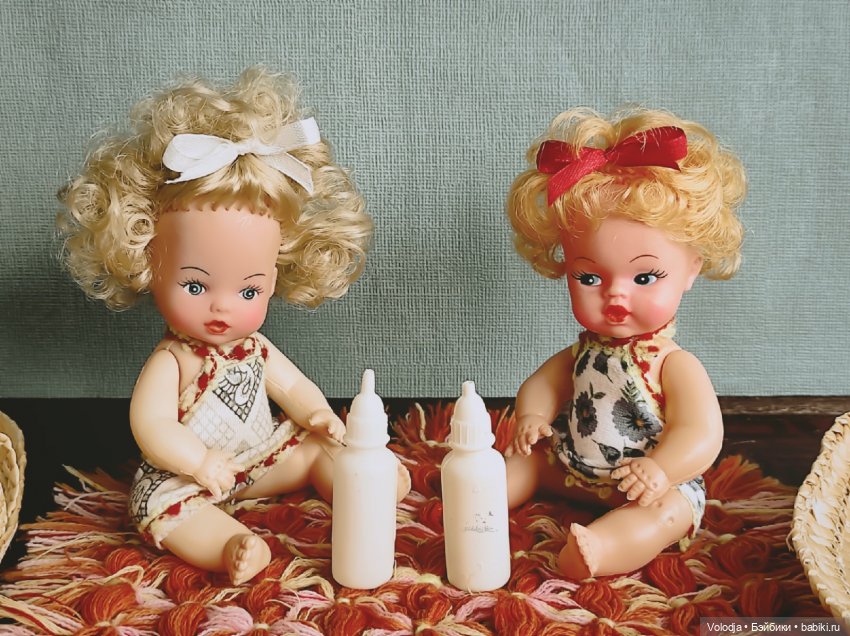 Я с удовольствием всех разглядывала, вот именно в плетёной корзиночке с ручками у нас был пупсик) с резиновой игрушкой. Были двойняшки в вязаных комбезах и шапочке, продавались просто в пакете, с бутылочками и пищалками. И глазки были по разному нарисованы — прямо смотрят или в бок. Мы с девочками выходили во двор играть с такими пупсяшками и искали отличия, у кого какие глазки, сколько нарисовано ресничек, какого цвета резиновая игрушка и пр. Ваша Мальвинка просто прелесть! А Пьер где своё ухо потерял?