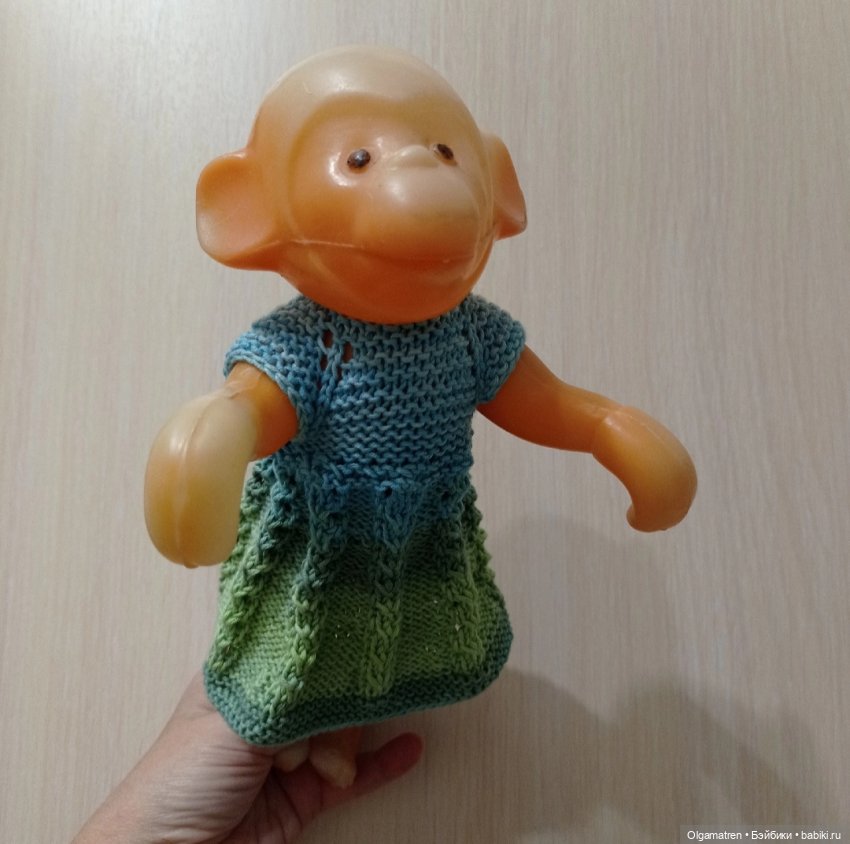 Это была первая кукла, на которой я училась вязать. Первый клубок который мне дали в руки, была домашняя овечья шерсть, бабушка у меня рукодельница была и пряла тоненько. Я связала длинную полосу, положила на неё Леночку, провела полосу между ножками, по бокам зашила, а на плечах бабушка помогла мне пришить пуговки. Странный был наряд. Что-то вроде купальника или песочника, но из овечьей шерсти)) для ребёнка 6ти лет наверное было шедевром. Да именно так мне и казалось. Вязала я одними лицевыми петлями — платочной вязкой. Клубочек ещё остался и я связала кофту для Оли Кирово-Чепецкой фабрики. Всё было связано из прямоугольников — спинка, две полочки и два рукава. Бабушка ещё мне вышивку сделала в технике рококо, на месте где кармашки бывают и кофта получилась просто невероятно красивой и девочки, мои подружки, даже не верили, что я сама связала, за зимние каникулы, но бабушка пришла на помощь и сказала — не верите? Садитесь на диван. Девочки сели, а мне бабушка дала начатое вязание и сказала — вяжи. Я стала вязать, медленно, стараясь не потерять ни единой петельки, укладывая их аккуратно в ряд. Девочки даже дышать забыли)) а я была невероятно гордой!