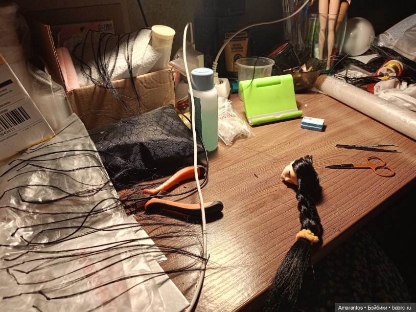 Первым делом я ее перепрошила. Для этого выбрала трессы в оттенке теплый блонд. Пробор здесь не предусмотрен, да и в образе, который я ей придумала, он не нужен. Думаю, все уже догадались, что кукла в моей голове стала невестой. Так что пробором я не стала заморачиваться. Кстати, на данный момент это моя самая быстрая перепрошивка — вечером села, этой же ночью закончила. Заняла где-то часов 8 без учета отвлекающих факторов в виде детей и домашних животных. Сама в шоке, если честно, но мне очень хотелось привести ее в порядок)