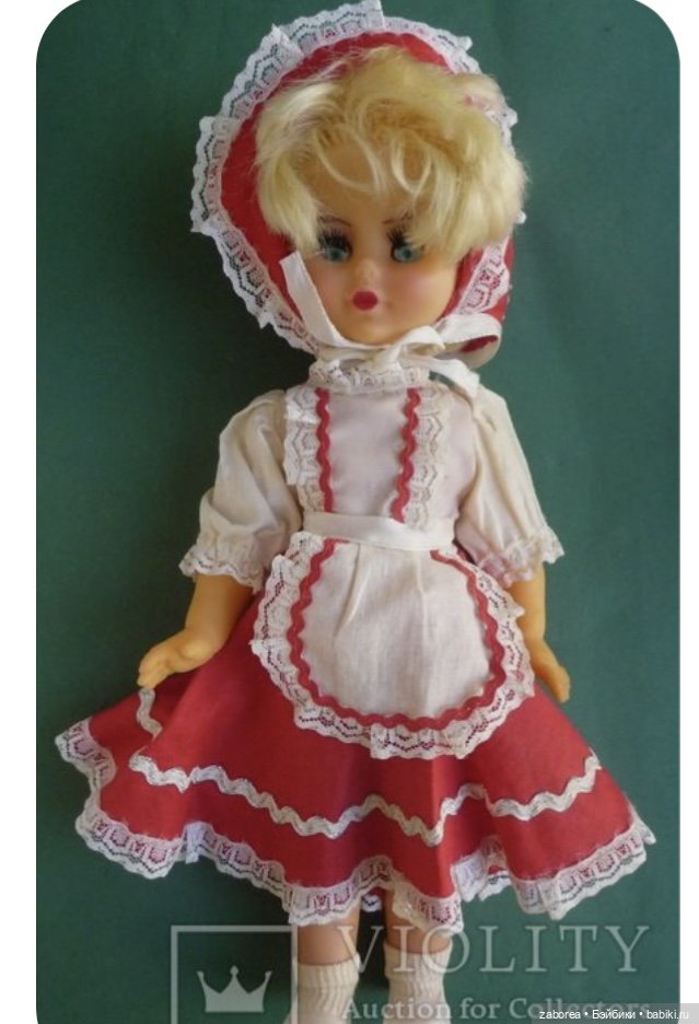 Пока писала топик, проявилась бывшая хозяйка темноволосой куклы. Ей кажется, что девочка была одета в красную юбочку в белый горошек, черную кофточку с полосочкой посередине, рукава тоже как юбка, в горошек, на голове красная панама в горох.