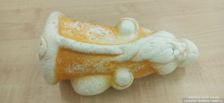 Вот дедушка из прошлых выписок. Он был весь закрашен красным фломастером или маркером. Даже сквозь акрил проступило(((( но не сразу, со временем. Видите шапка с пробоиной, я тогда только умела их мыть и красить. Можно будет взять его на долечивание и исправить все царапины и вмятины.