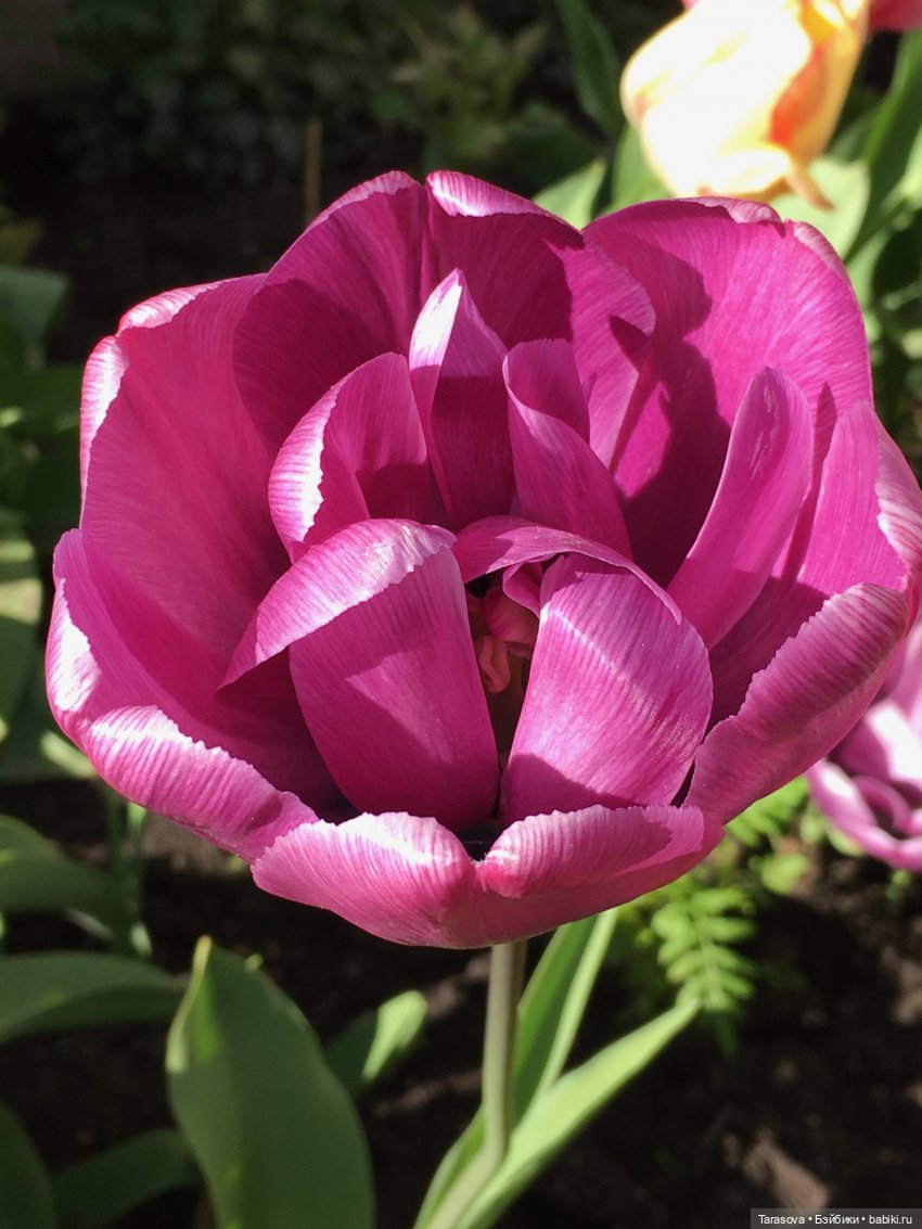 Это пион Сорбет. Пару лет назад он приехал заболевшим корнем, лечила его от грибка, потом его маленькие листики, только выросшие из земли, сжигало палящее солнце, он выпускал еще росток и он тоже сгорал. Я уж думала, не жилец. Но продолжала бороться за него, поливала всякими поддерживающими препаратами, укрывала от солнца, и вот он окреп и радует красивыми цветами