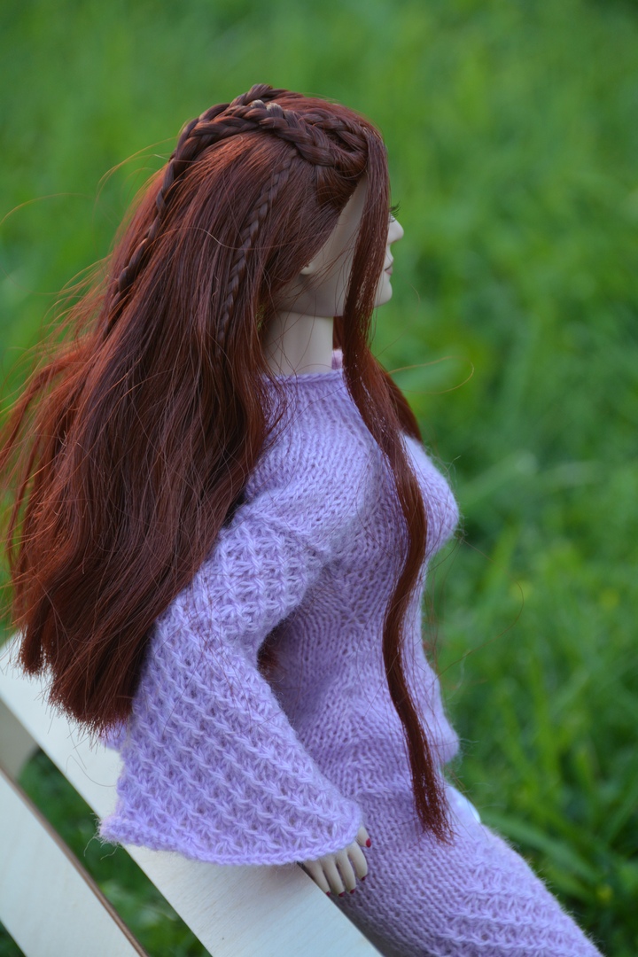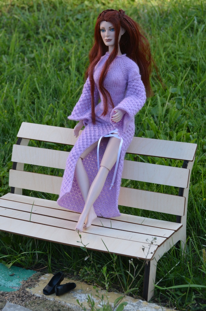 Платье на кукле моей работы, связано на спицах «единичка» из пряжи «Тест 72» производства московской прядильной фабрики «Семеновская пряжа». Модель платья так же придумана и разработана мной.