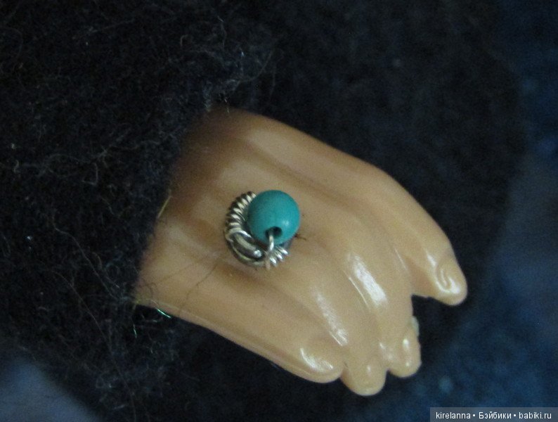 На пальце сидит очень просто: между пальцами макетным ножом сделана прорезь, и в неё вставлено само кольцо (оно немного боком расположено относительно навершия с бусиной), проволока достаточно толстая, прорезь узкая, сидит плотно. А как и из чего — это надо спрашивать волшебницу Олю kraso4ka, перстень её рук дело ;)))