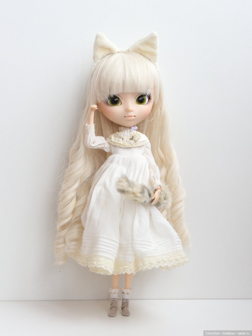 В комплект входит кукла, подставка стандартная Pullip, чокер с бусинкой на шею, и пелеринка с вышитыми бисером цветочками. Шапочка с ушками и хвост уже привязаны к кукле. Хвост — за талию, и висит он крепко. Но на голове такая конструкция скользит по волосам куклы, поэтому пришлось укрепить уши за волосы, двумя заколками-крабиками в цвет.