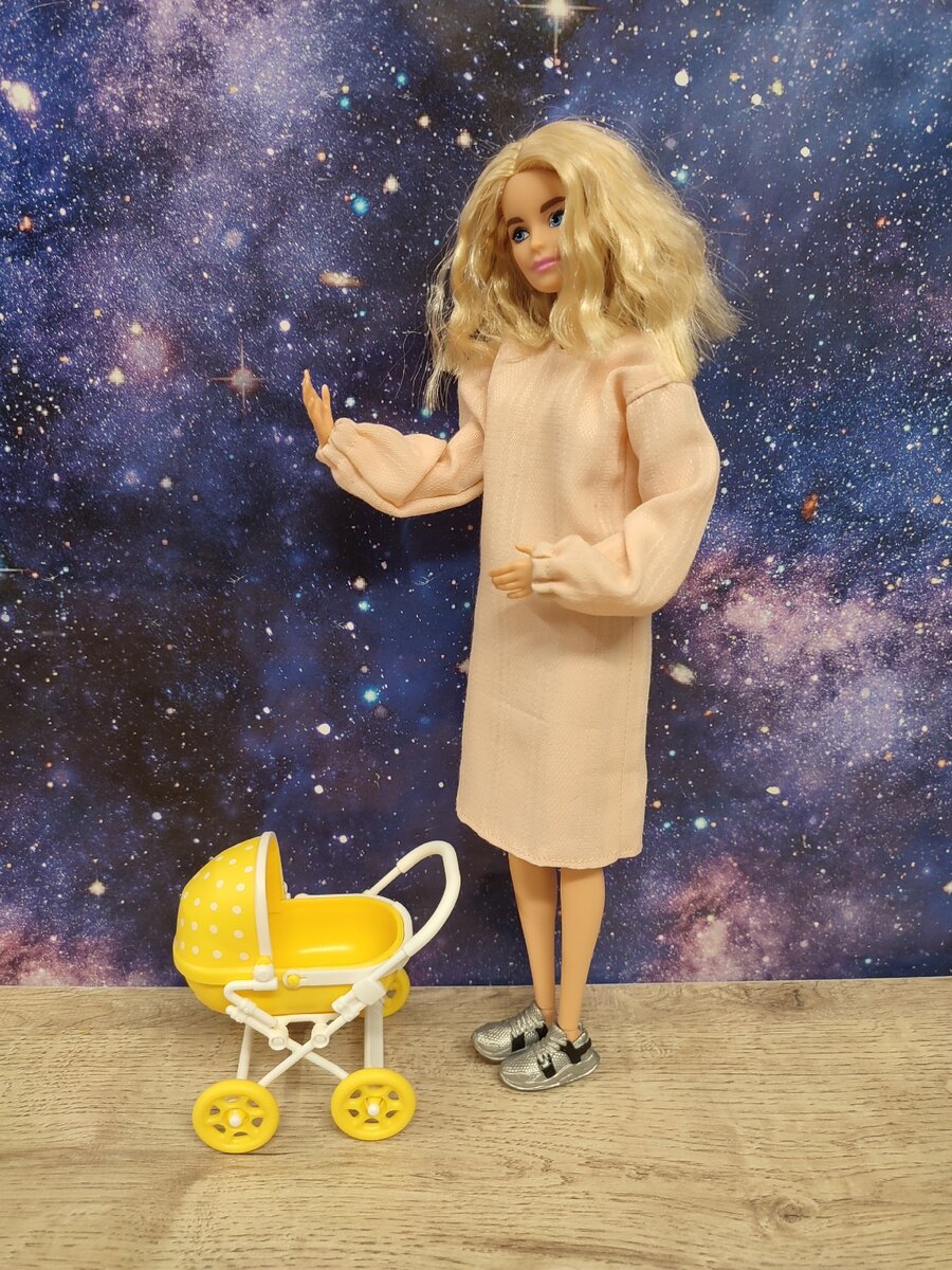 Ребенок смотрится вполне вразмерным кукле 1:6 (Барби), а вот коляска для нее игрушечная совсем.