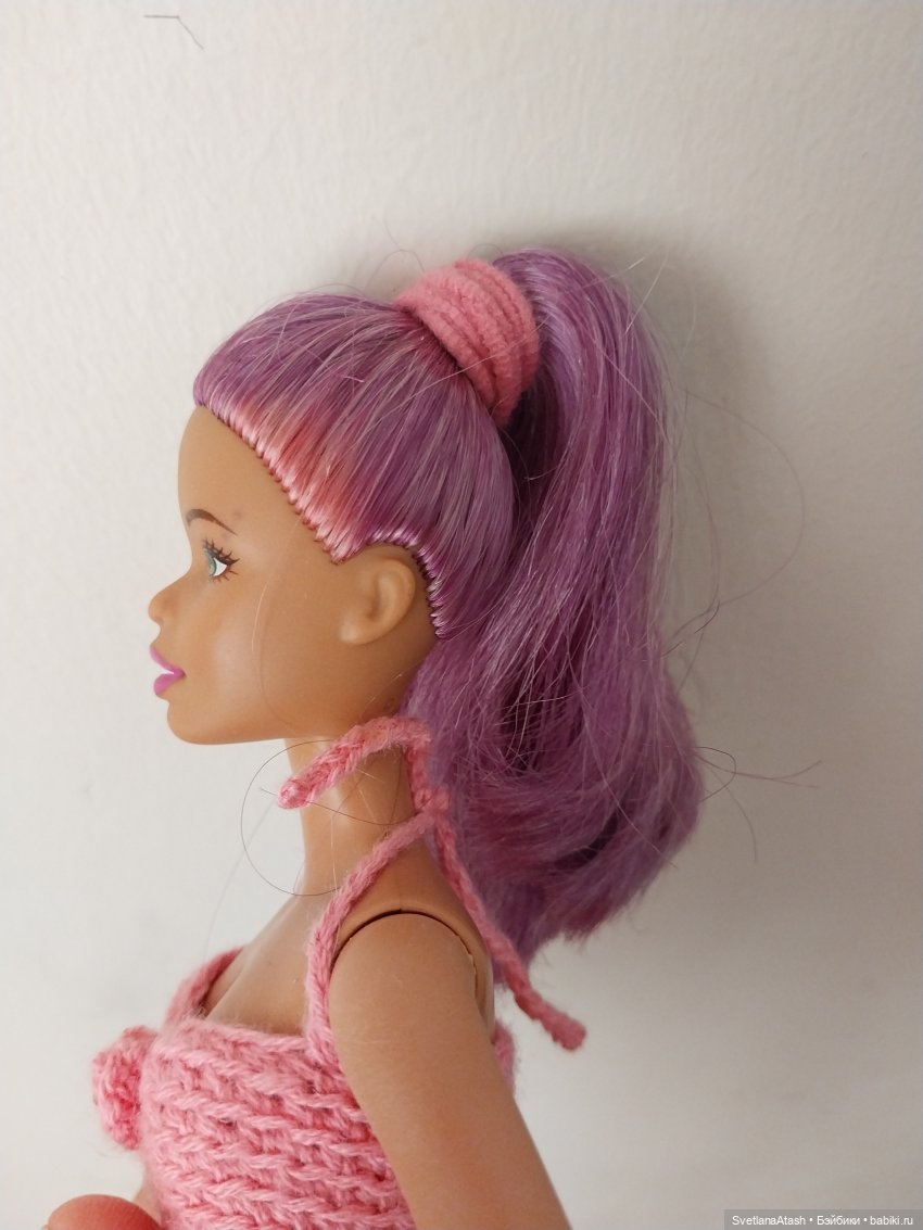 Голову приклеила к шее, чтобы девочка хозяйка больше не смогла её оторвать. Когда клею голову куклы всегда держу куклу головой вниз, чтобы клей (супер-клей) не протек на шею: