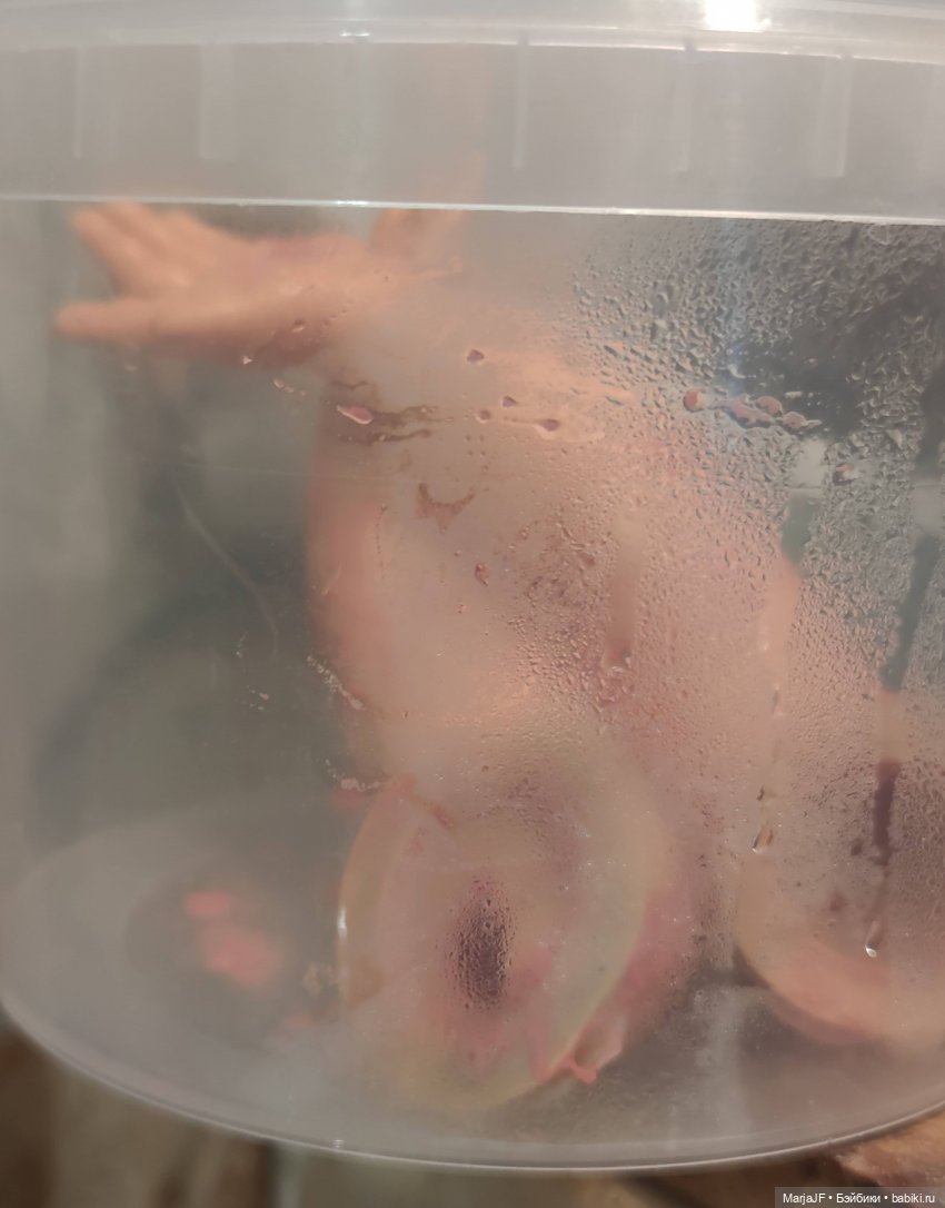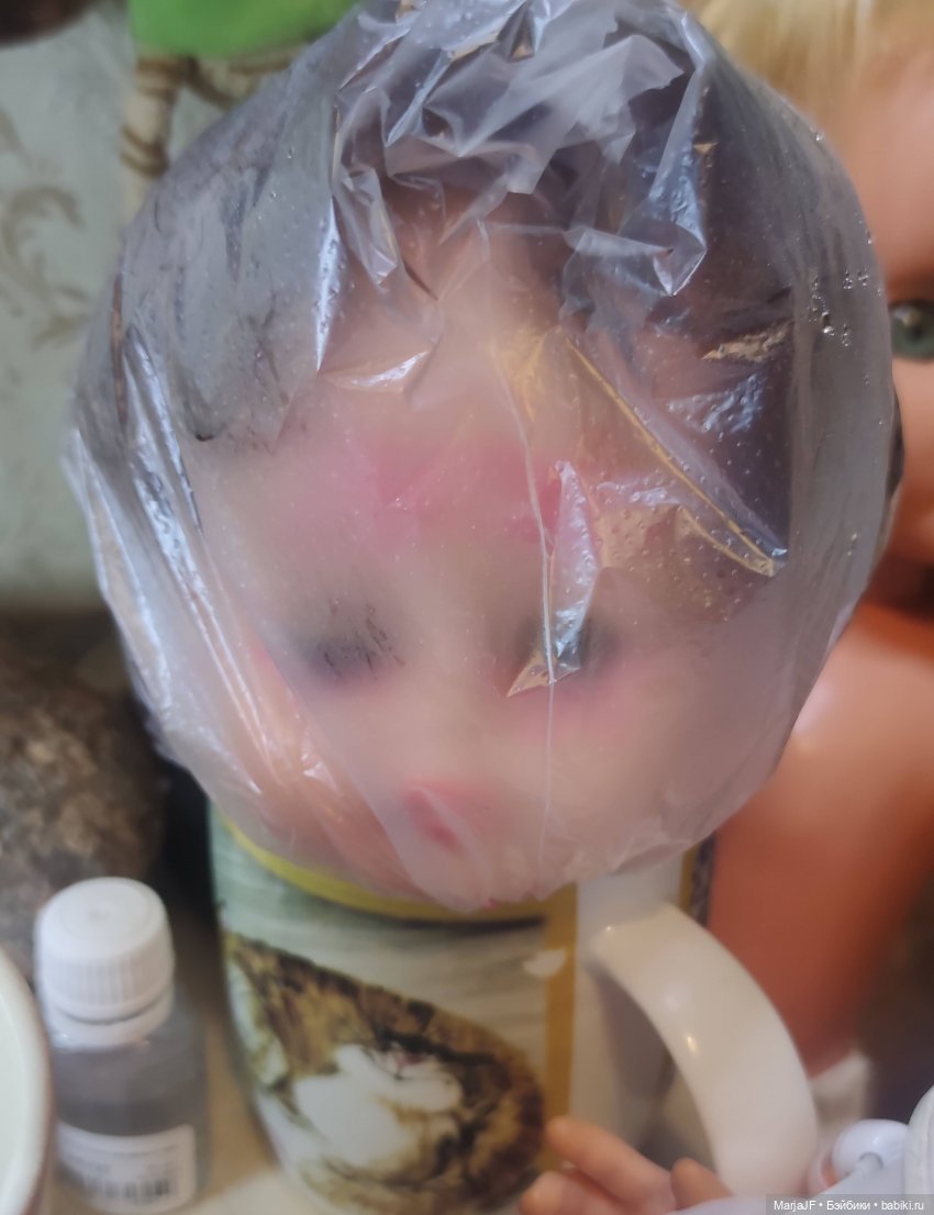 А это голова, закрученная в пакет. Она просто стоит на столе, но у нее в анамнезе не «чернота немок», а детский макияж, ее вчера только намазала и надо проверить как оно там будет реагировать. Да и ведро занято)