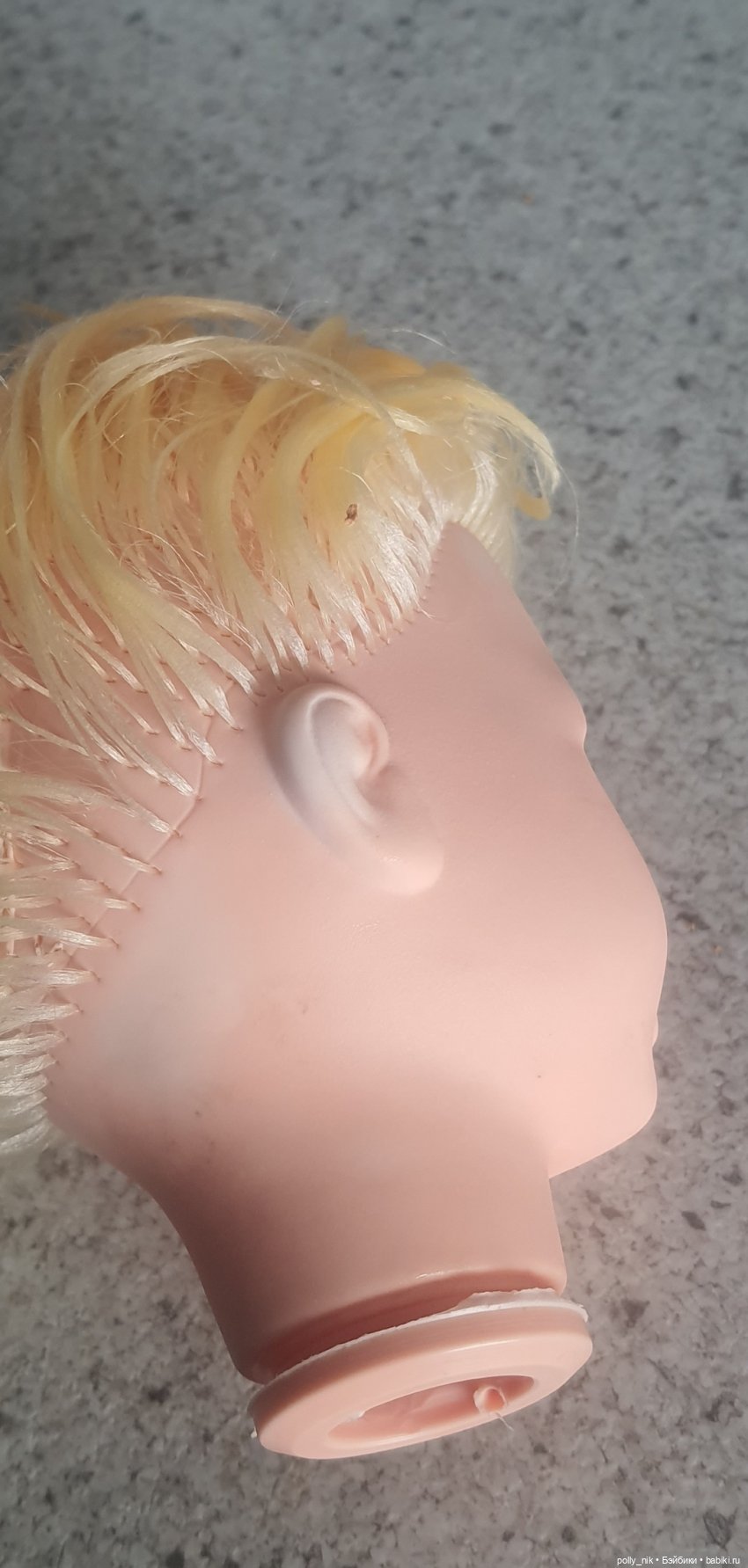 Пришлось очень изворачиваться с освещением, чтобы серые следы внутри винила вообще были заметны на фото. На просвет потемнения внутри винила тоже есть. Сейчас я обрабатываю эту голову осветлителем 9% с периодом отдыха между обработками примерно в полтора месяца — за это время оставшиеся следы потемнения не становятся ни темнее, ни светлее, а состояние винила не ухудшается.