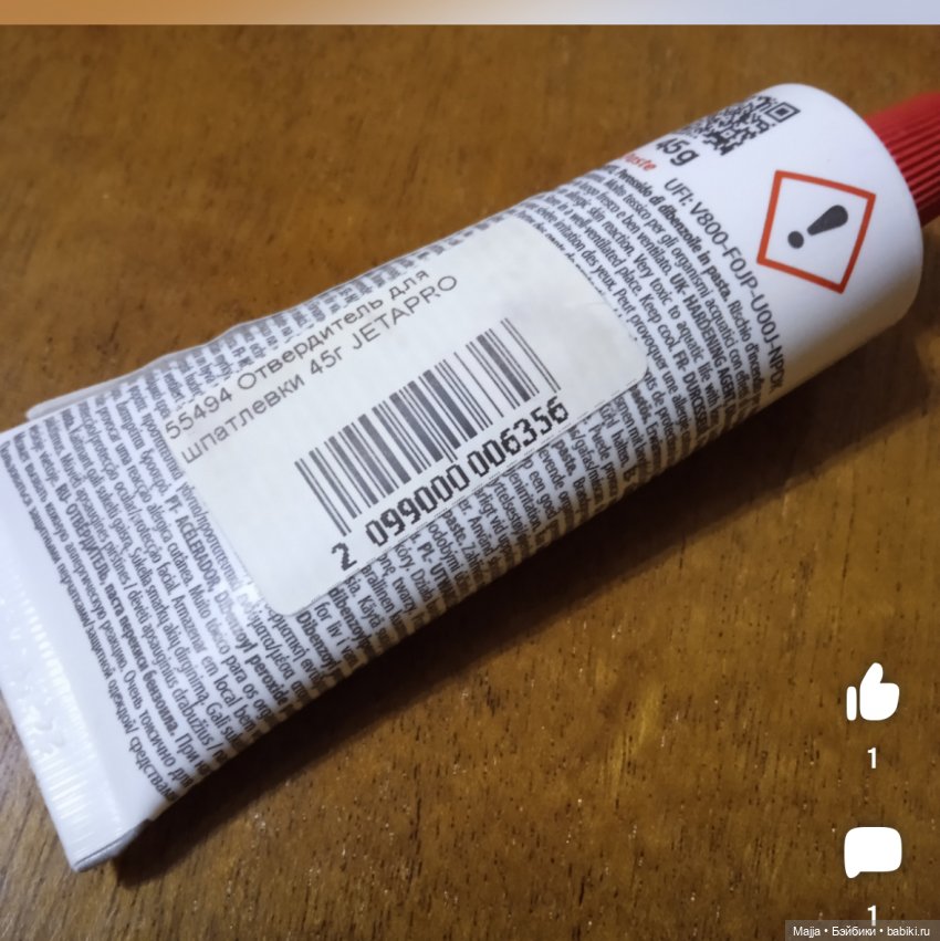 Однако в продаже есть набор шпатлëвка + отвердитель, набор называется тоже Джета Про, но дизайн тюбика на фотографиях как раз соответствует моему варианту и не соответствует тому, что у других пользовательниц Бэйбиков.
