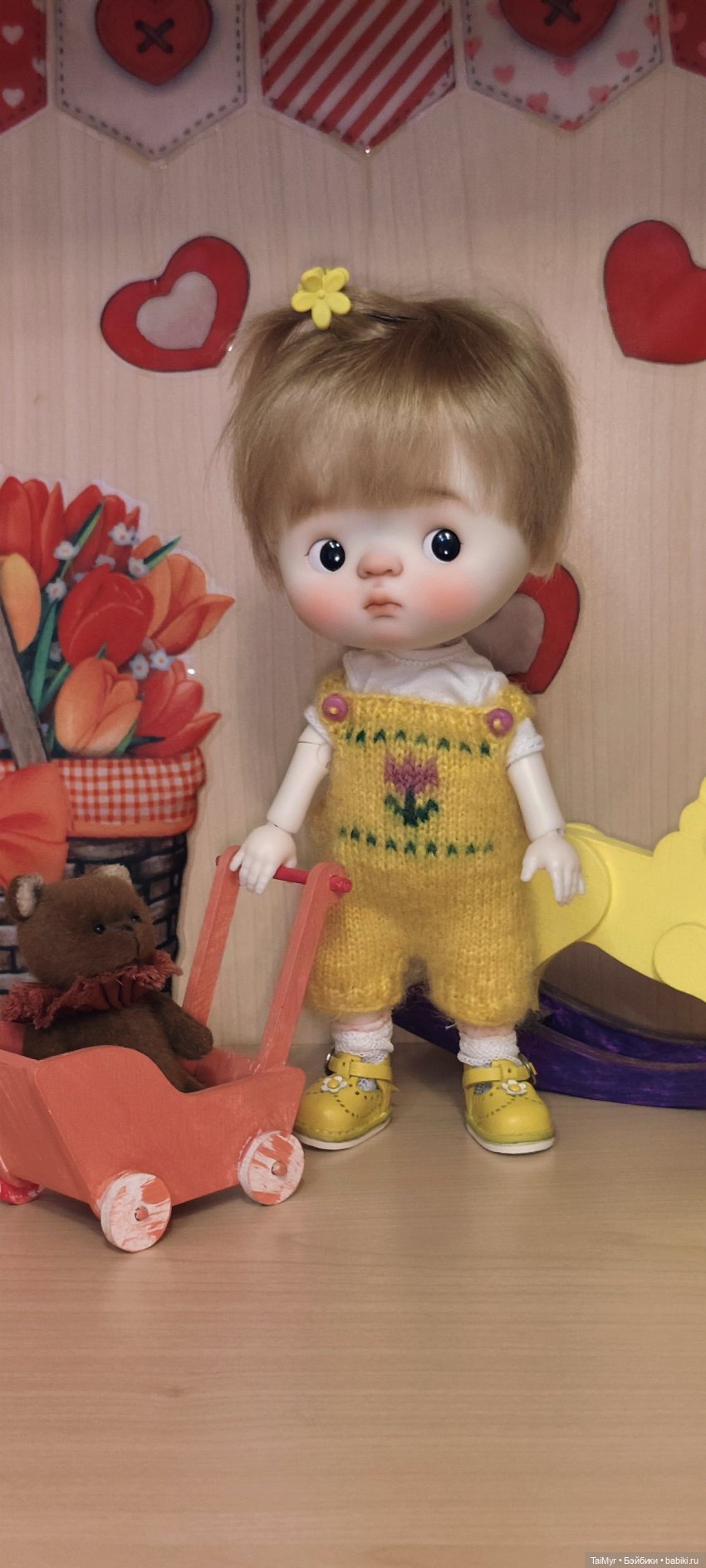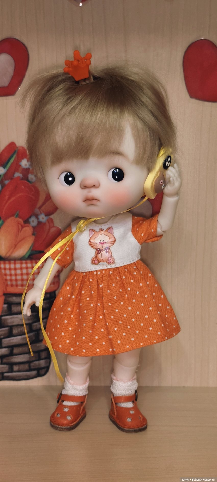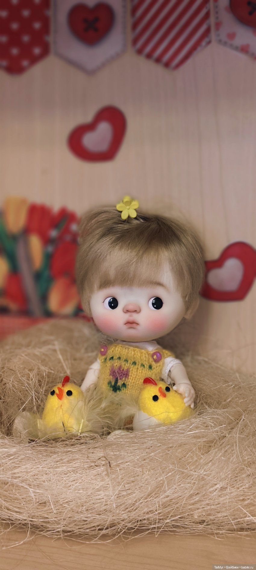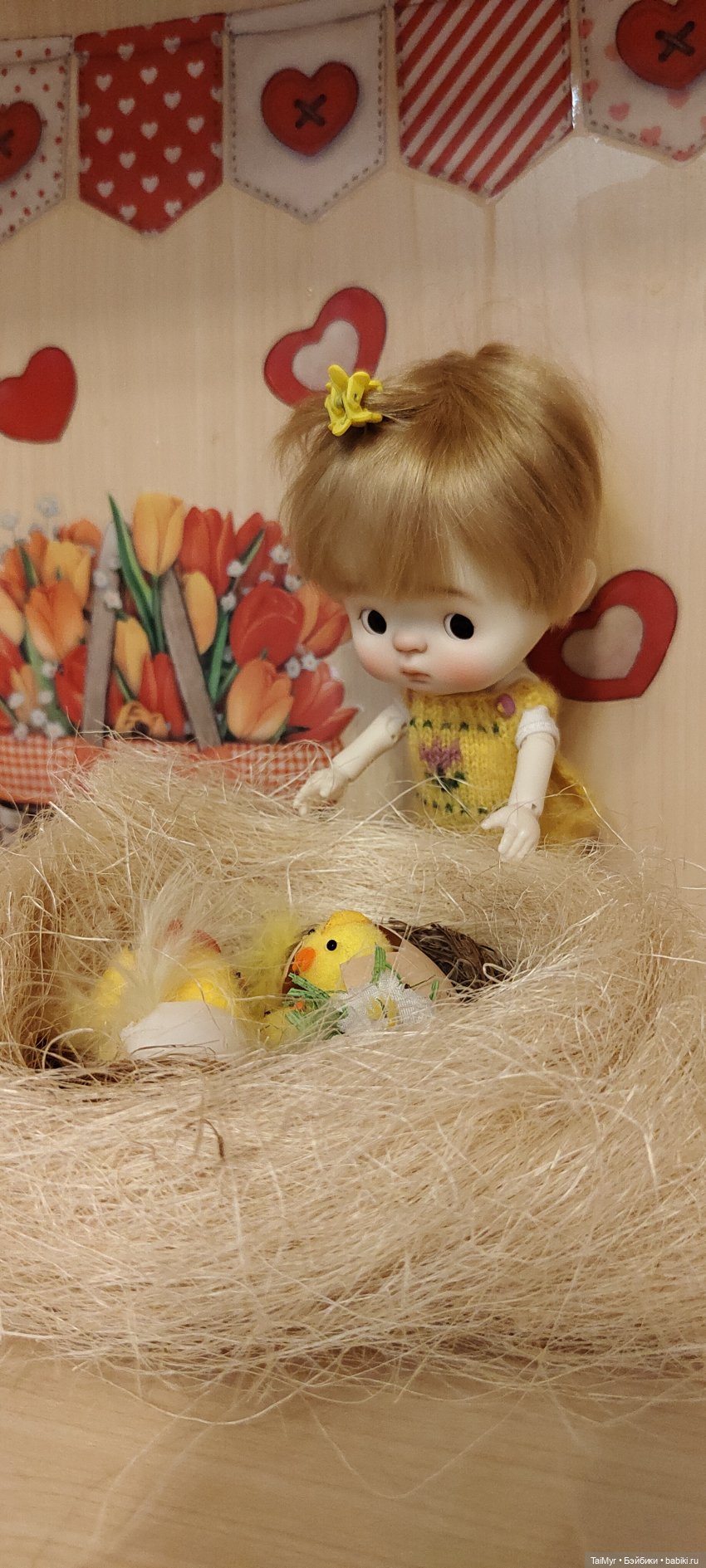 Доброго времени суток! Вот и приехала моя вторая куколка, купленная в этом году. Это мой подарок, самой себе на 8 марта! Кого то находят в капусте, кого то приносят аисты, Киттюша сидела в гнезде с цыплятками среди тюльпанов. Малышка очень делова, отжала одежду у всех, кто живёт в нашем доме, выпросила телефон и видимо делает заказы к 8 марта😂