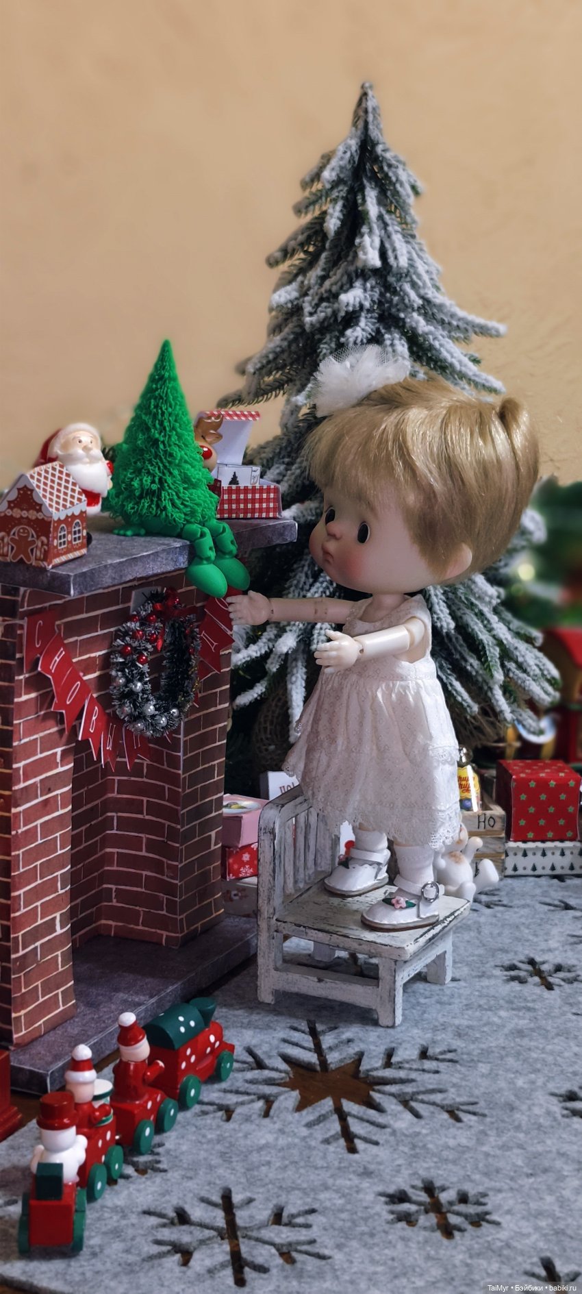 -Ой, а кто это там на камине сидит? — спросила малышка и не дожидаясь ответа решила достать маленькую ёлочку.