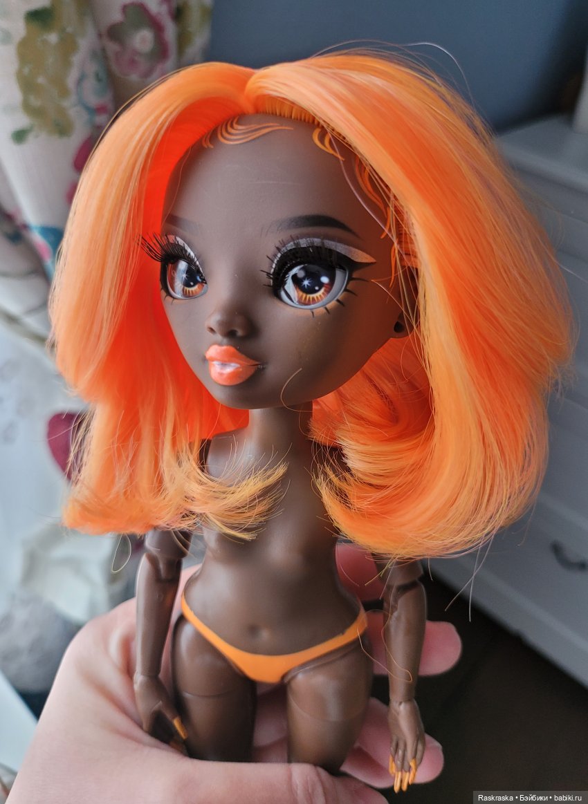 Опять — таки, я точно знаю почему не покупаю Викторию и знаю почему не покупаю Оливию. А вот Мишель — мне кажется из-за того что она такая вся оранжевая и с короткой стрижкой (у меня преобладают куклы с длинными волосами видимо потому что я люблю их им причесывать:)) — я как — то о ней и не думала. Но это до поры до времени как оказалось:)). Пригляделась я значит к ней поближе. Во-первых, личико у нее очень красивое, да и это новый тип лица, бровки очень красиво нарисованы, весь макияж очень аккуратен. Прическа — очень классная стрижка на самом деле, удлиненные пряди спереди. Ну и не такая уж короткая стрижка — до плеч сзади, спереди до груди спокойно достает. Цвет потрясающий. Как маркеры (я то же и о Присцилле писала — не просто цвет а именно вот Цвет:)). Почему я не купила Мину в свое время — отчасти из-за того что мне в ней не хватало вот этого контраста, глубины, сочности. В-общем, девушка заселилась
