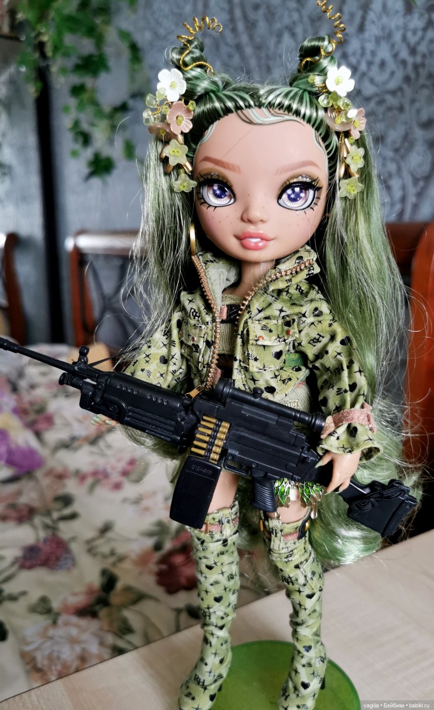 Оливия оказалась очень серьёзной и немного воинственной милитари девой. И даже сходу затребовала вразмерный автомат (который я чуть не купила на Али). Но потом решила, что автомат для радужки — это как-то слишком, поэтому ей пришлось ограничиться феном)