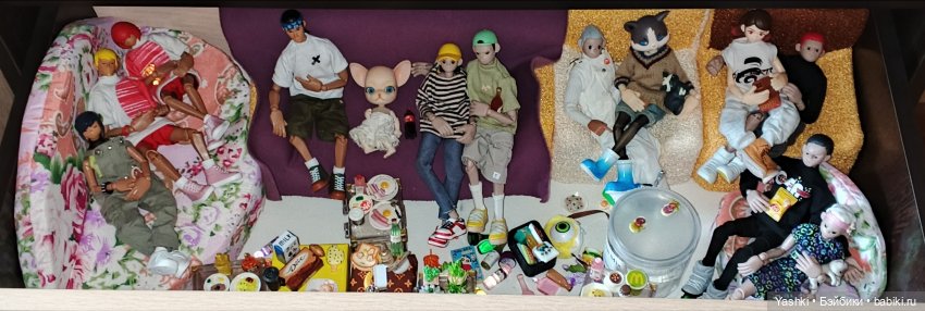 Зайцы сразу осели на полку, не заходит анимешное такое, но на полке забавно было, когда были лишние полки. Комчартсы какое-то время поактивничали и стали полочными, сейчас в комоде, с местами край. Шкафа пока нет.