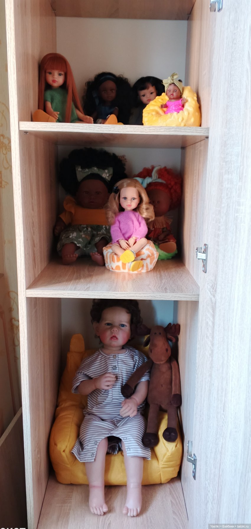 Мишка — Реборн приехал пока крайним. Но он фантастический деть, он классно покрашен, натуралистично. И являет собой годовалика наверное, но с соображалкой на уровне студента. Вундеркинд. Ну не заходит у меня то, чего не было и уже не будет. Оно мне не известно и непонятно. Но при этом момент потискать и поняшить просто на руках. Пожмякать, поцеловать — заходит. Вот я его достаю, жмякаю, целую и одновременно разговариваю с ним как со взрослым. При этом он своего возраста. Ну это же мой житель, моя фантазия. Как-то так. Мой Зам по испанскому шкафу, в котором и живёт. Он не в ночнушке, а в расстёгнутом песочнике, думала буду ему гнуть ножки для удобства, на кресле, но решила без необходимости не делать, это не так легко как шарниры гнуть.