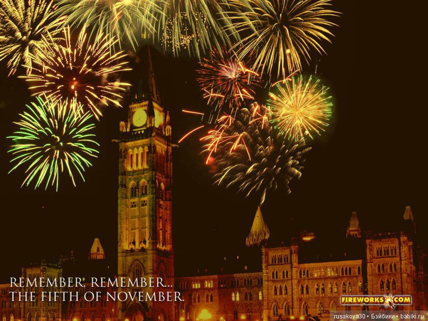 А в ночь с 4 на 5 ноября в Лондоне организуется настоящее костюмированное шоу. Люди в старинных нарядах стражников рыщут по подвалам в поисках заговорщиков, шествуют с факелами по улицам, танцуют вокруг костров и запускают в небо тысячи фейерверков.