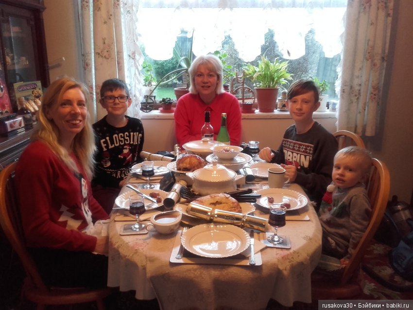 Это наши внуки и дочка мужа, все в рождественских свитерах.