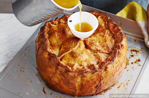 Замачиваем желатин в крепком бульоне, когда он разбухнет, разогреваем и размешиваем до полного растворения желатина. Остывший желатиновый раствор заливаем через отверстие в крышечке пирога после того, как пирог испечется.