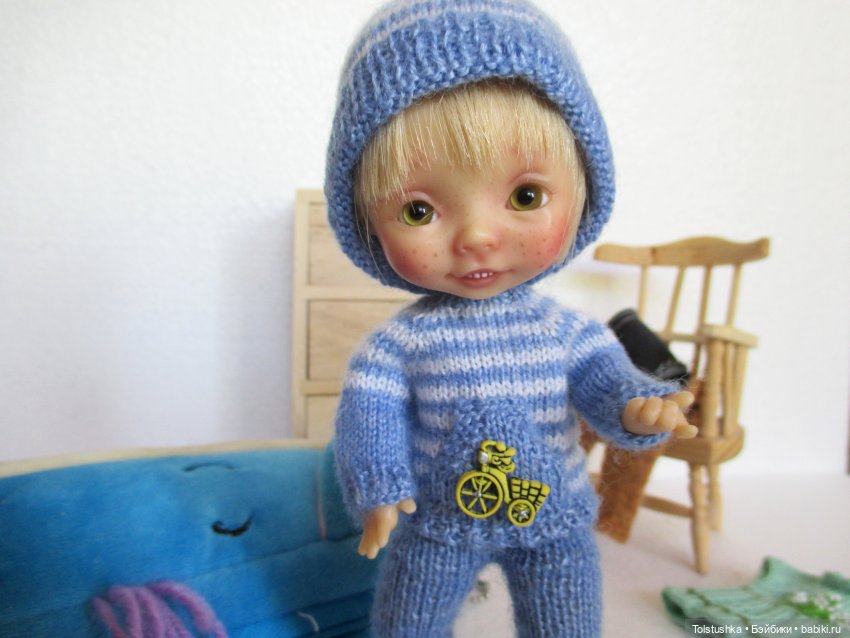 P.S. Но это годится только для кукол с твердым телом. У мягкотелых пупсов руки растопырены, и на них реглан приходится вязать с очень длинной проймой, некрасиво это. Для этих лучше сшивной.