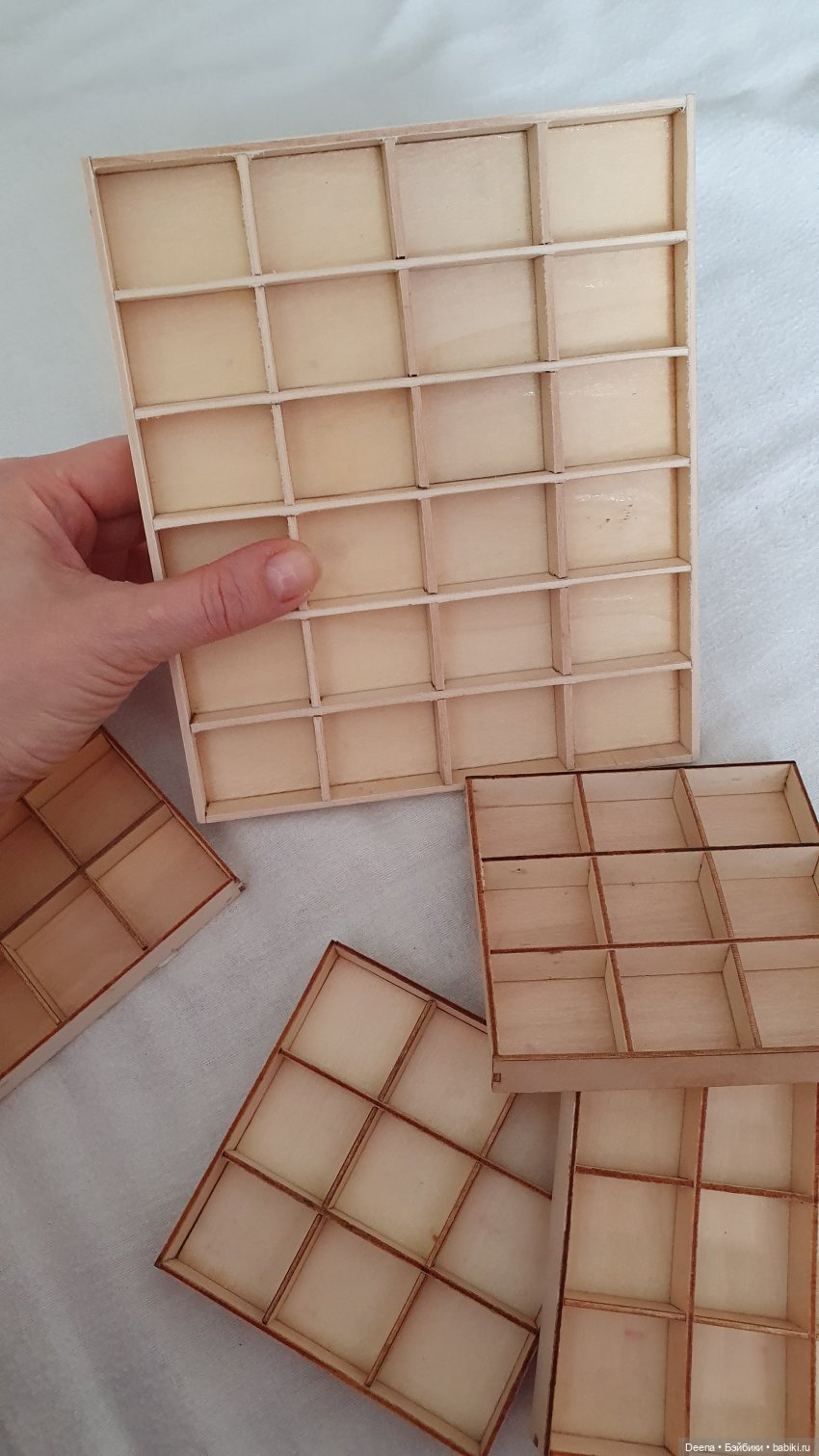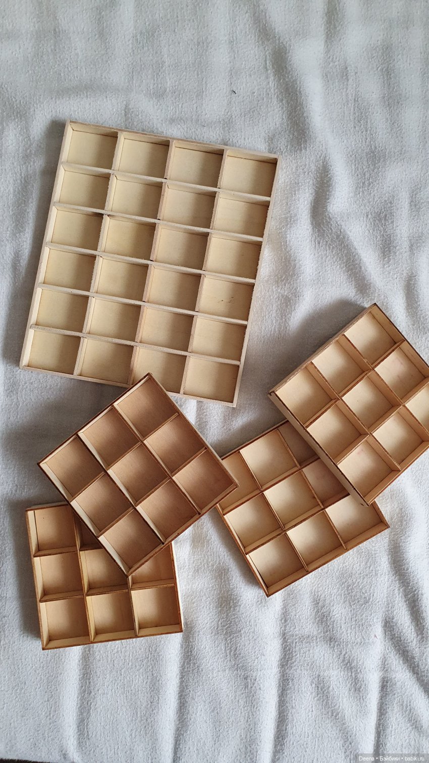 А я вот такие нашла — меньше и не такие глубокие… из тонкой фанеры. Они были всякой мелкой ерундой наполнены — бусинками, висюльками… брала из-за упаковки, но и бусины пригодились — дочка украшения делает теперь всей семье 😄😄😄