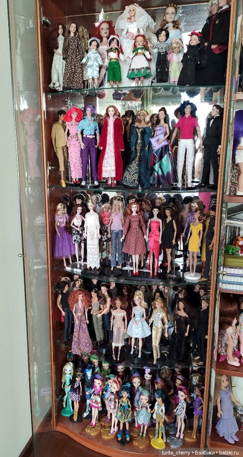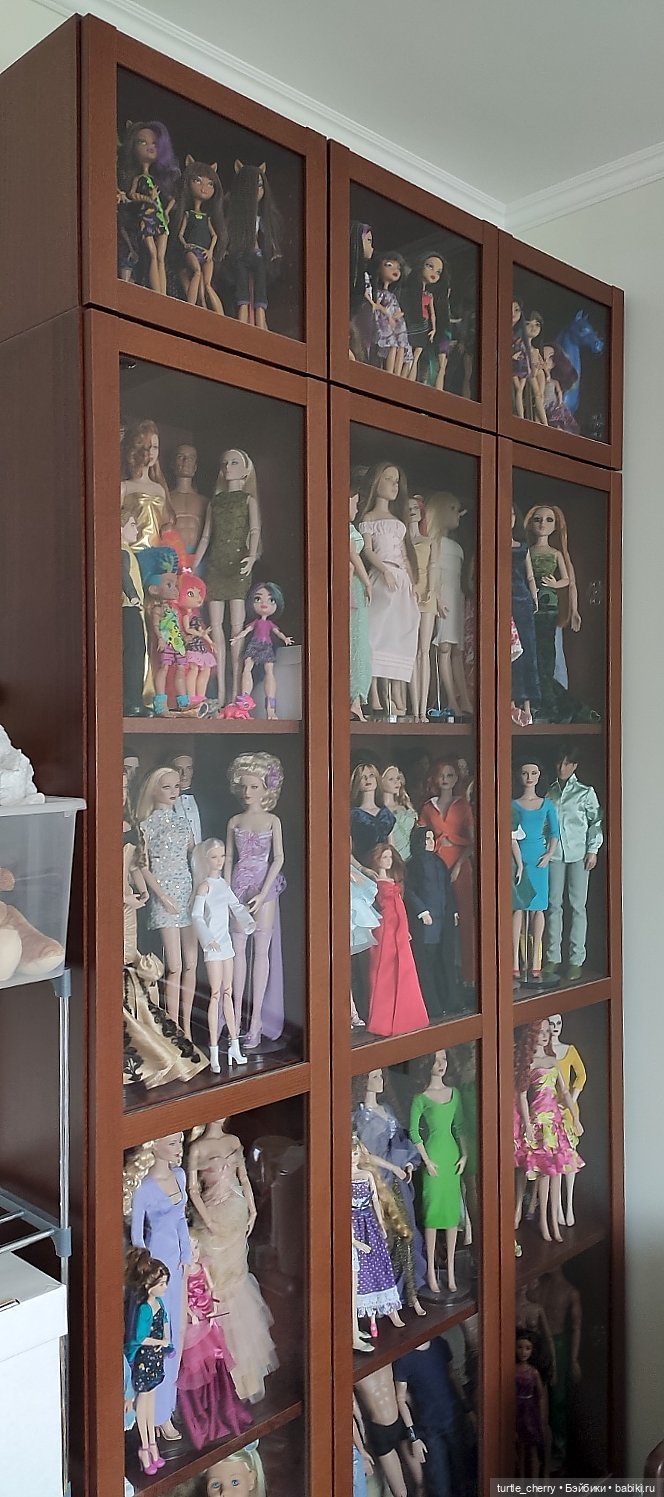 Кукол у меня сейчас в районе 500, может даже больше уже. Два шкафа-витрины (в одном формат 1/4, в другом 1/6) и в кладовке еще кучка коробок. И паолки на комоде и открытых полках.