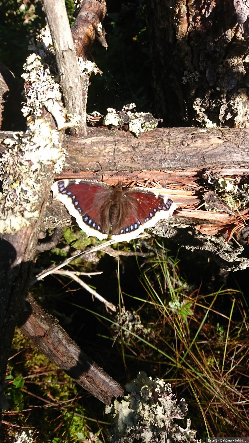 Опять пошли с мужем в лес. На этот раз повезло: попались лисички. Брусника не уродилась. А ещё нас несколько раз накрывал дождь. Слепой! Но холодный, у нас не выше 11 градусов. Такое ощущение, что уже конец октября. Пока муж лазал по кустам, я полюбовалась симпатичной бабочкой, которая прямо-таки позировала на сухом стволе.