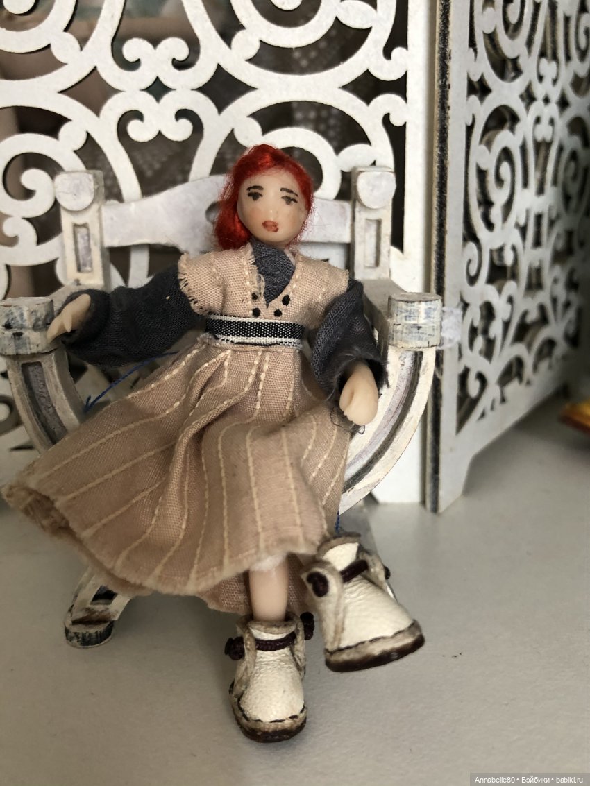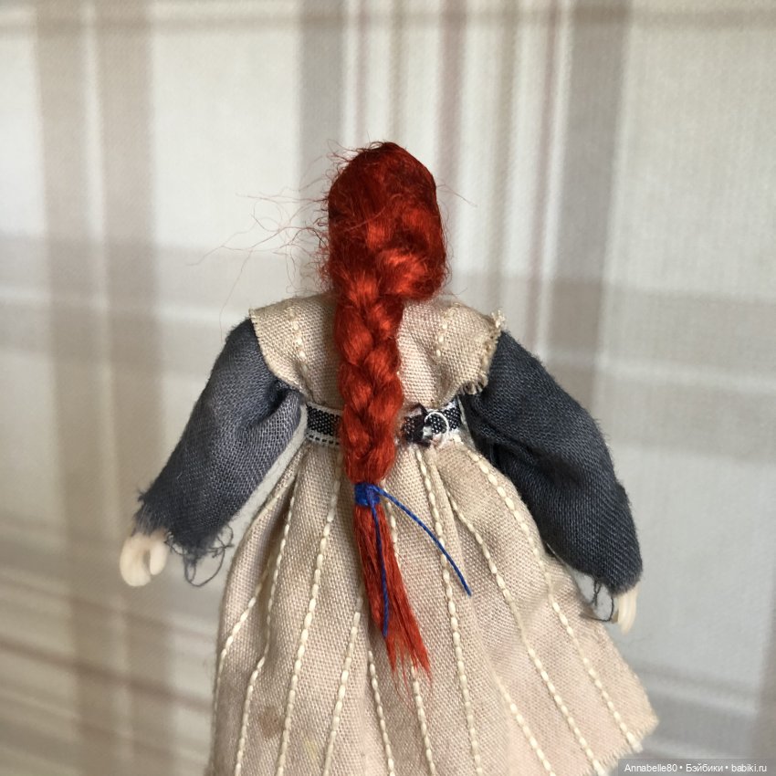 Белкину куклу зовут Катрин, она каркасная, в смешанной технике, рост — 8 см, ручки и ножки сгибаются. У неё есть своё креслице: