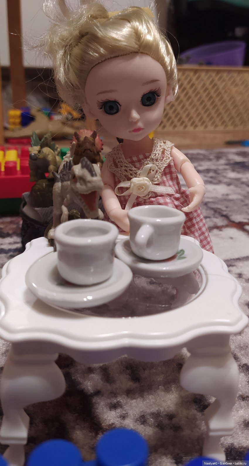 Сегодня день суетливый, дел было много. Под вечер лениво было рукодельничать, решила посмотреть, что у меня в закромах есть. Я в приступах Хомякоза в прошлом году набирала много чего для кукол, сразу не открывала. Лежат запасы, правда уже небольшие. Какая-то дурацкая у меня психология: куплю и жду какого-то момента, чтобы распаковать… и получить радость. Ну, типа допинга в сложный момент))) Достала столик и посудку, примерила для новой своей куколки. Устроили с динозаврами чаепитие)))