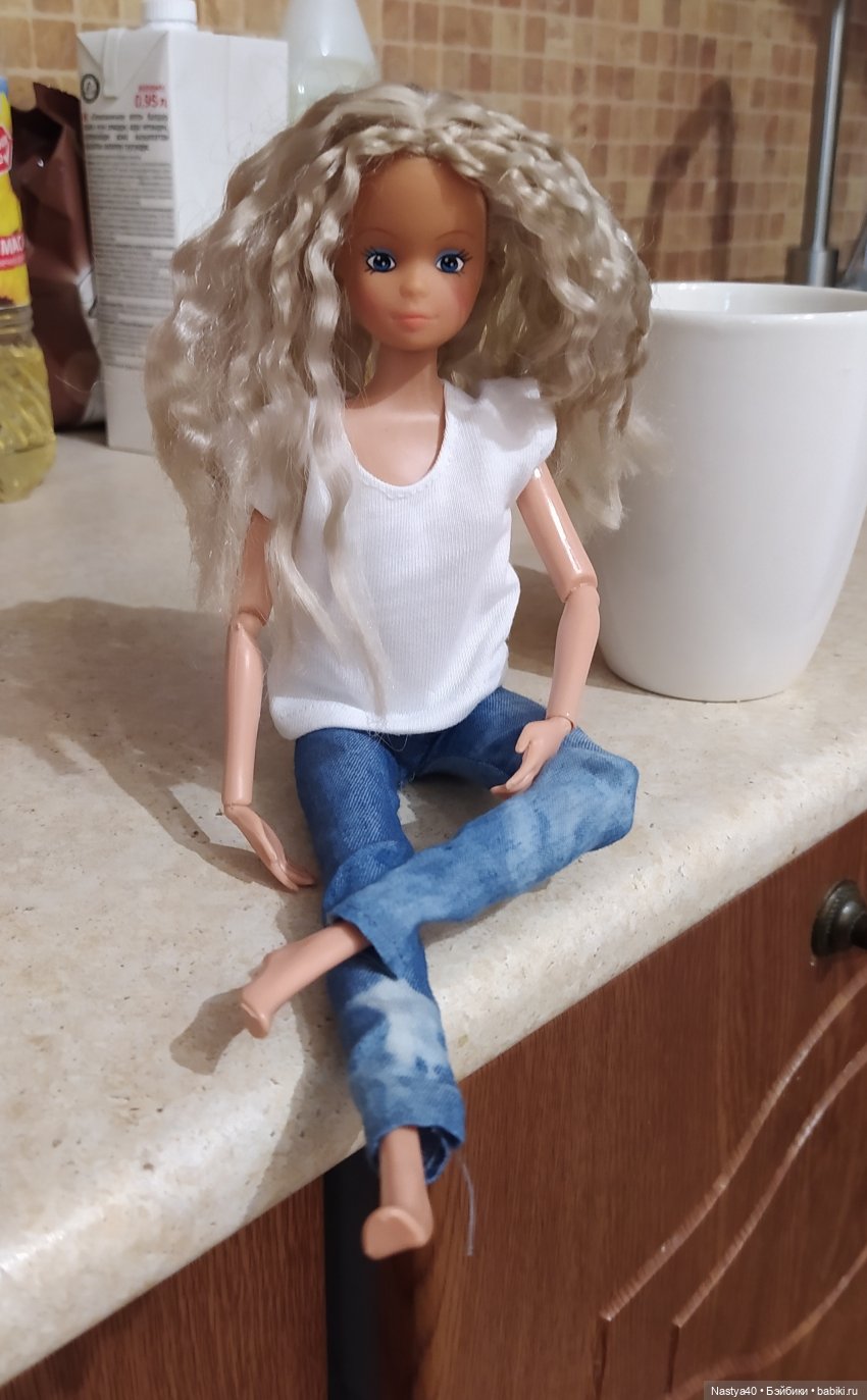 У меня суббота как суббота: плита — раковина, уборка по мелочи… Пока готовила, слушала рок-баллады: Металлику и Скорпионс. Старею, наверное, вот и потянуло на динозавров рок-музыки. Расплела косички Штеффи (давно она у меня с ними была, готовилась к причёске), одела в джинсы. Раз уж она получилась у меня шарнирной, попробовала ее посгибать.