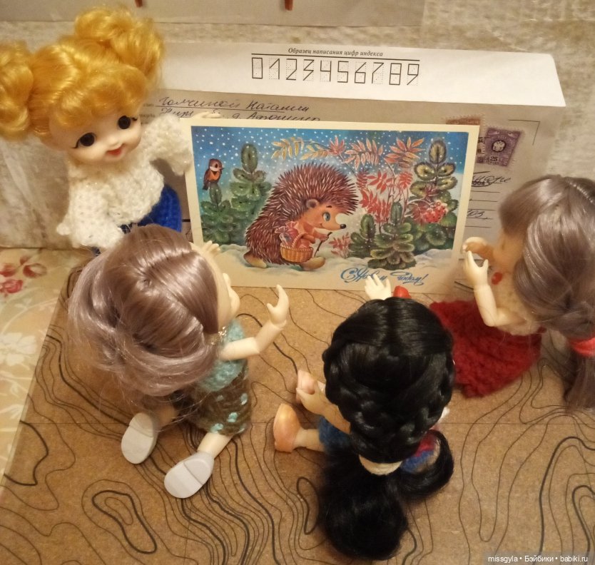 Потихоньку прихожу в нормальное состояние после гриппа, слабость и кашель проходят. Сегодня супруг принес еловых веток, чтобы в доме пахло ёлкой, сделала два букета, по комнатам расставила. Всем родственникам подарки приготовила, себе тоже — Софи блондинка с лета сидит в шкафу, пришла пора выйти))) Открытка пришла, тоже с ежиком! Очень здорово и приятно!!! У меня за прошлый год собралось штук десять советских открыток, я решила начать их коллекционировать)))