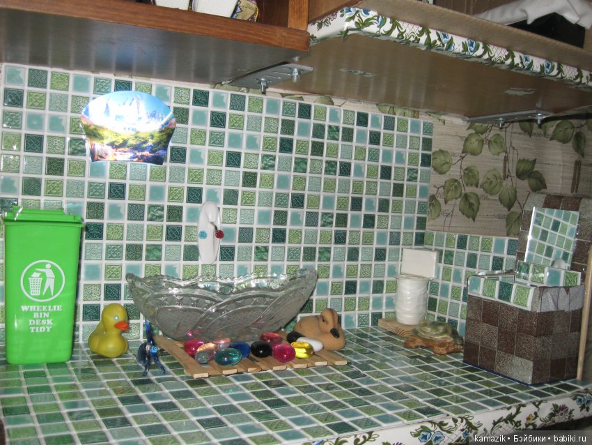 А это ванная комната. Сама ванна пока в виде конфетницы. А унитаз сделала из стаканчика из под йогурта и спичечного коробка.