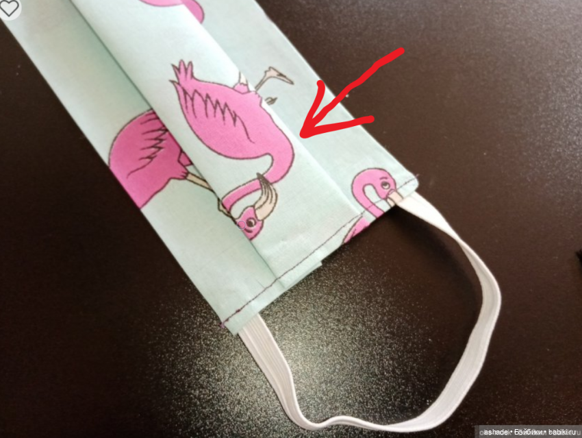 4. Вставляем концы резинки (2 отрезка по 16 см на 1 маску). Закрепляем булавками.