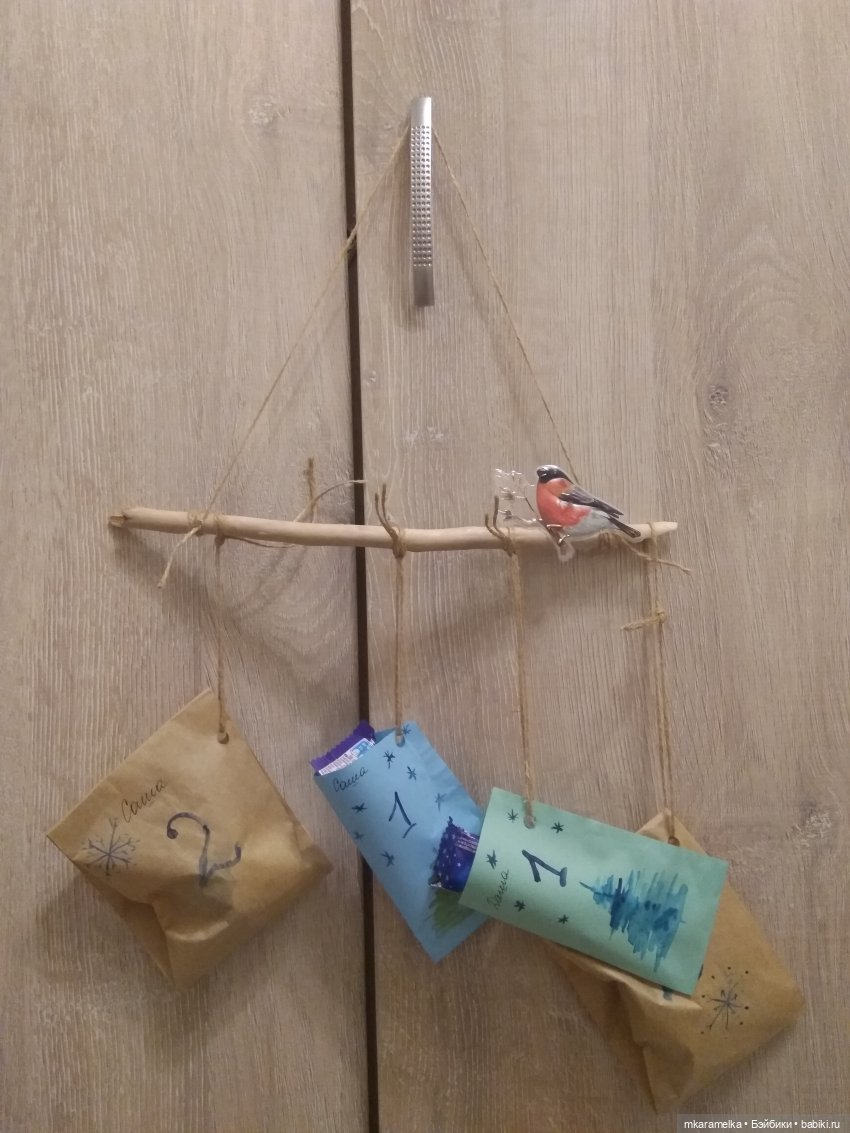 Так как тема моего СП — минимум денег на оформление, то заворачивать подарки мы будем в обычную бумагу. )) Маркером нужно написать день месяца, когда свёрток можно открыть. По желанию добавляйте поздравление или какие-то приятные слова.