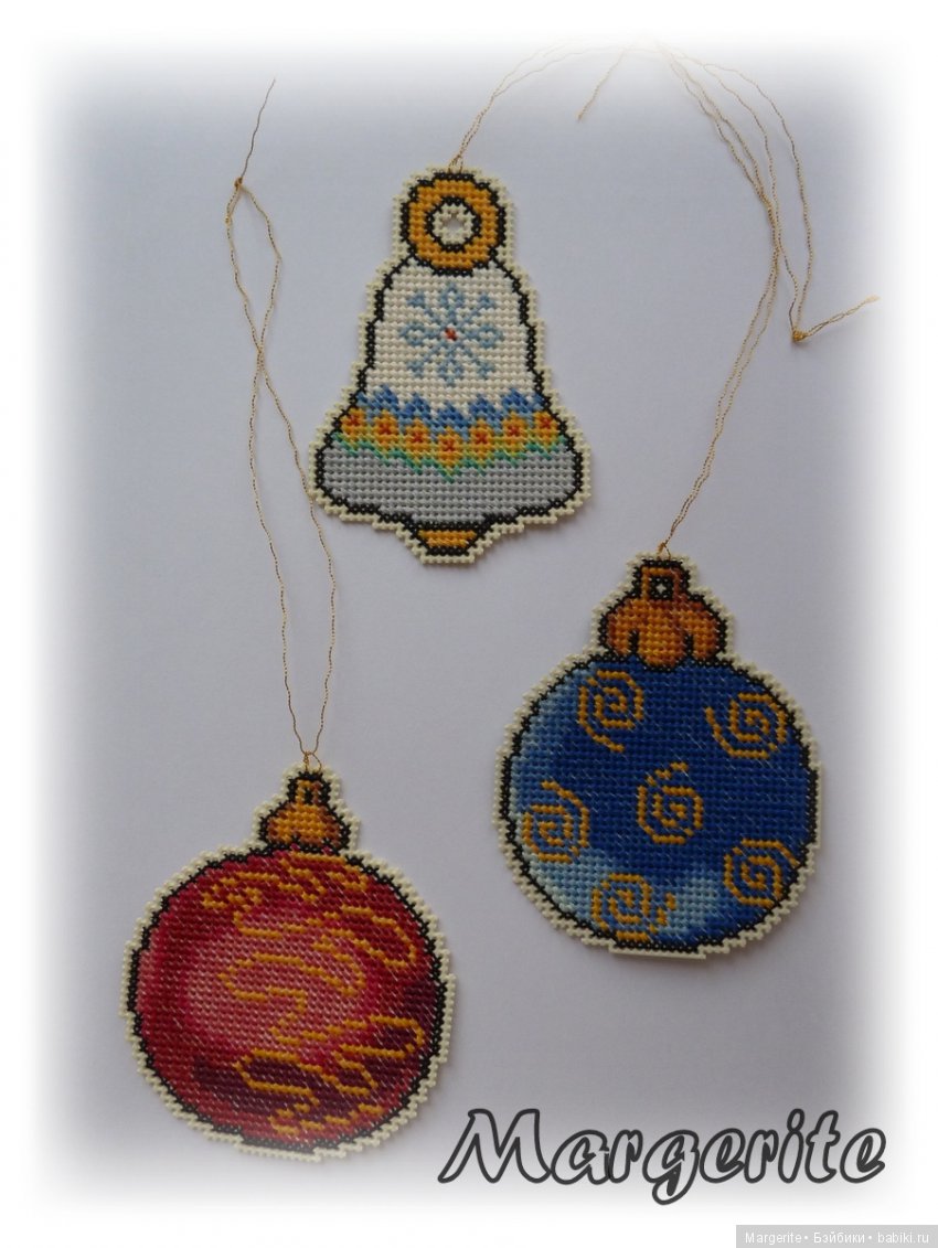 Очень понравились елочные авторские игрушки ручной работы, которые вышиты крестиком.